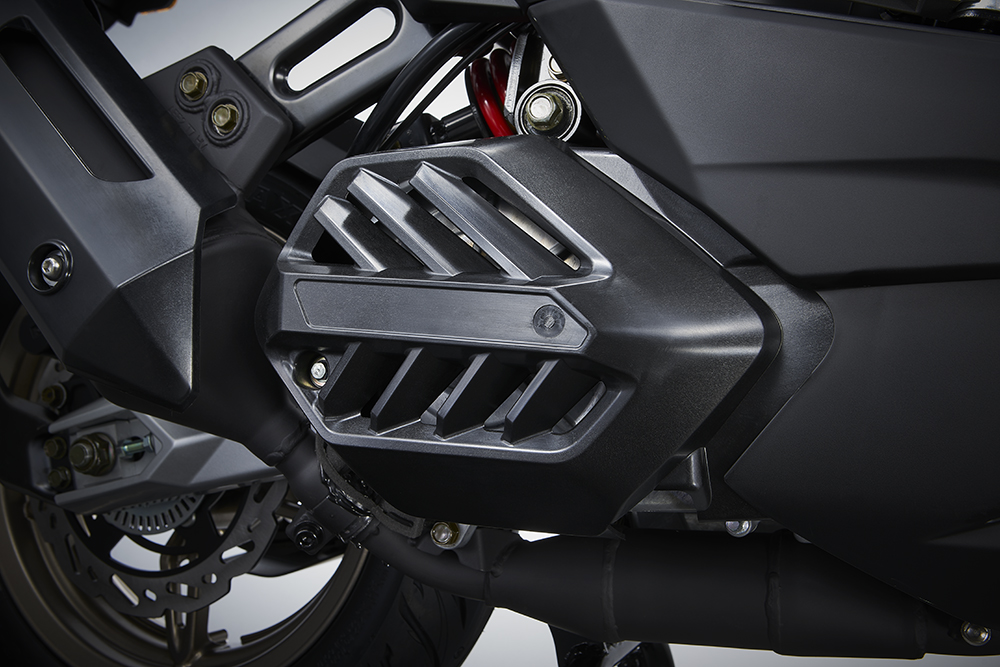 受到傳動機構(gòu)的影響,KRV的水冷排風散熱設計,與目前的水冷小踏板不同,水冷散熱器的位置安裝在車身左側(cè),風扇在右側(cè)。