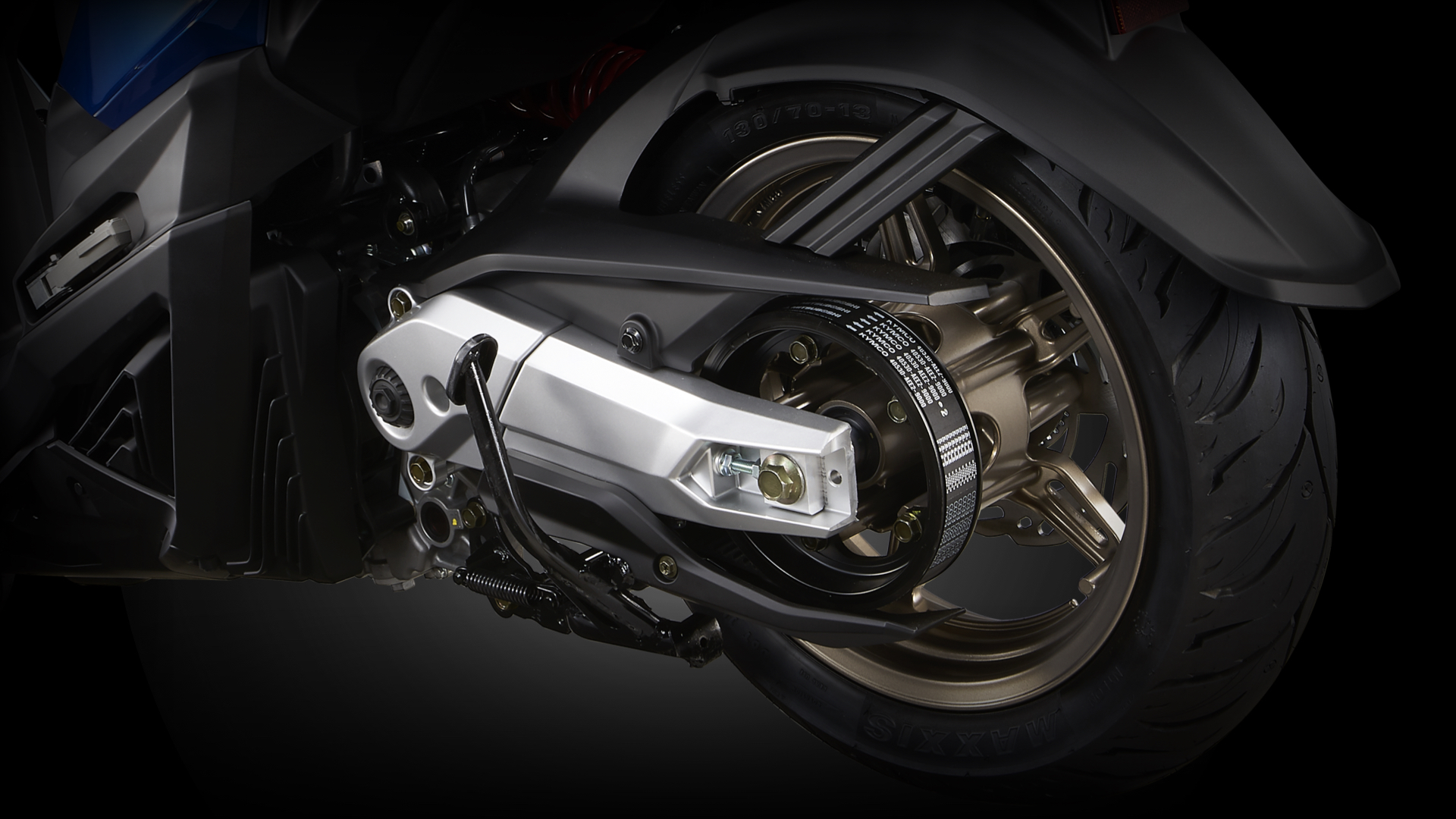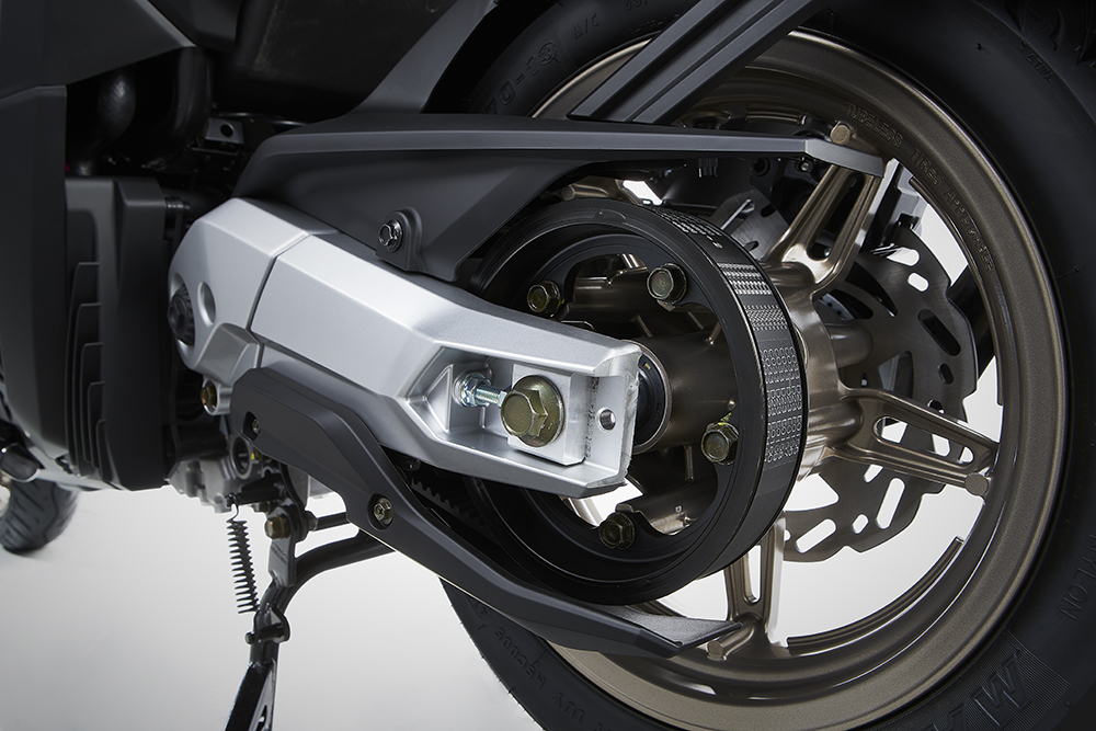 另外后搖臂和傳動系統(tǒng),采用與AK550相同的PTM傳動機構(gòu),外露的傳動皮帶是一大亮點,鋁合金的后搖臂也很有高級感。