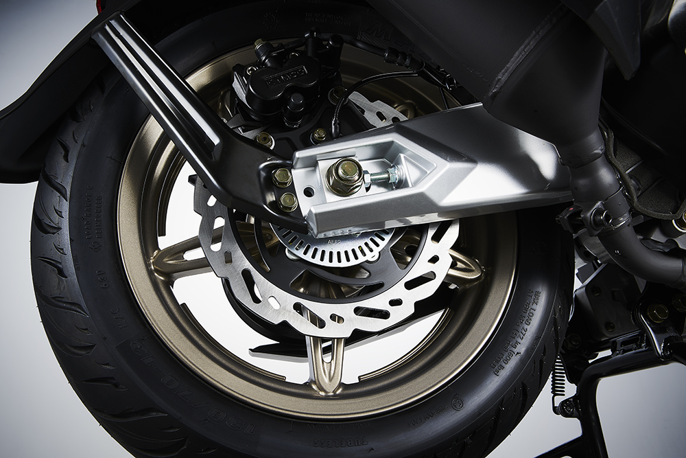 后剎車同樣是浪花碟的形式,而且是雙活塞的剎車卡鉗,比大部分踏板后制動的規(guī)格要高,前后剎車都有ABS防抱死系統(tǒng)。