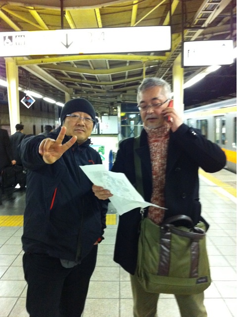 正在電話磋商徽章設計的美術指導佐藤先生和大友先生(剪刀手那位)。