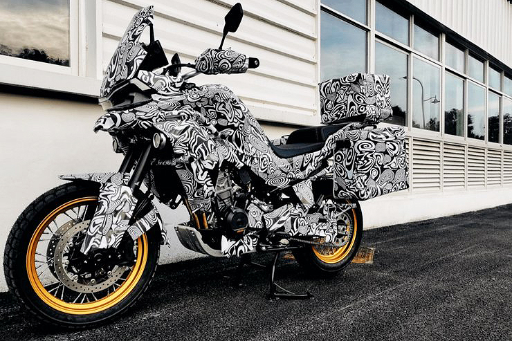 可調(diào)節(jié)的倒立式前叉,叉頂?shù)恼{(diào)節(jié)螺絲清晰可見,避震可能是由KYB提供,大尺寸的液晶儀表無法確定是不是全彩形式。來自KTM 790的發(fā)動機清晰可見,另有前制動雙盤,鋼絲條幅式輪圈,全地形輪胎,大面積的發(fā)動機地盤護板,目前所能知道的就只有這些。