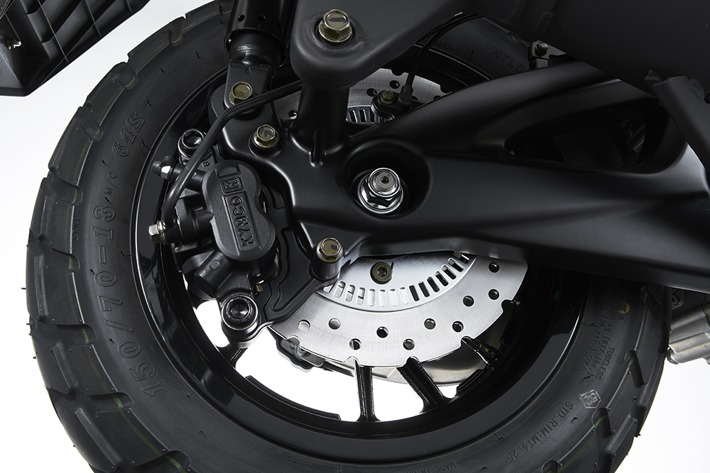 后制動系統(tǒng)為單向雙活塞卡鉗,后搖臂以及卡鉗的安裝位置和規(guī)格,都與Downtown 350一模一樣,前后制動標(biāo)配ABS防抱死系統(tǒng)。