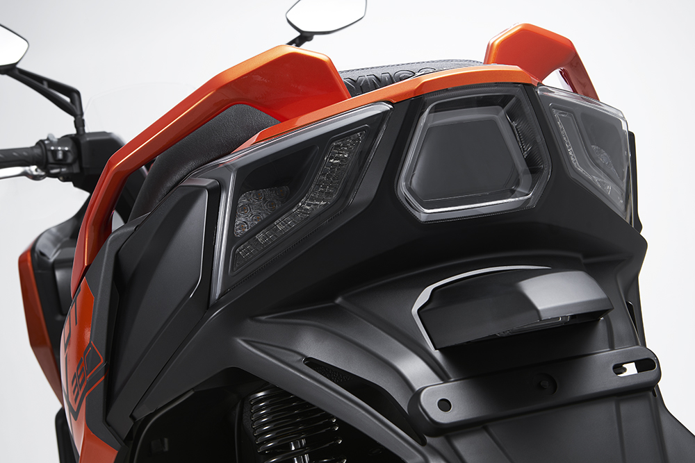 前制動系統(tǒng)為單向三活塞卡鉗,Downtown 350保持一致,前輪胎尺寸為120/80-14,后輪胎尺寸為150/70-13,配備了正新的多功能輪胎。