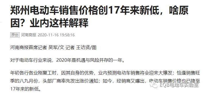 其實(shí)2020年,有這種困擾的并不止小牛一家。因?yàn)橐咔橹?,行業(yè)價(jià)格戰(zhàn)正逐漸變?yōu)槌B(tài)。且今年的價(jià)格戰(zhàn)在時(shí)間和空間上都脫離了從前價(jià)格戰(zhàn)的概念,不僅持續(xù)全年、覆蓋全國,且一二線品牌幾乎全線殺入,不管是商家還是企業(yè),都不計(jì)代價(jià)把爭取銷量奉為圭臬 。近日,更有河南商報(bào)記者撰文表示,在慘烈的價(jià)格戰(zhàn)之下幾乎所有品牌都在咬牙虧本賣特價(jià)車,現(xiàn)在的電動(dòng)車甚至比2003年的“老爺車”價(jià)格還要低!