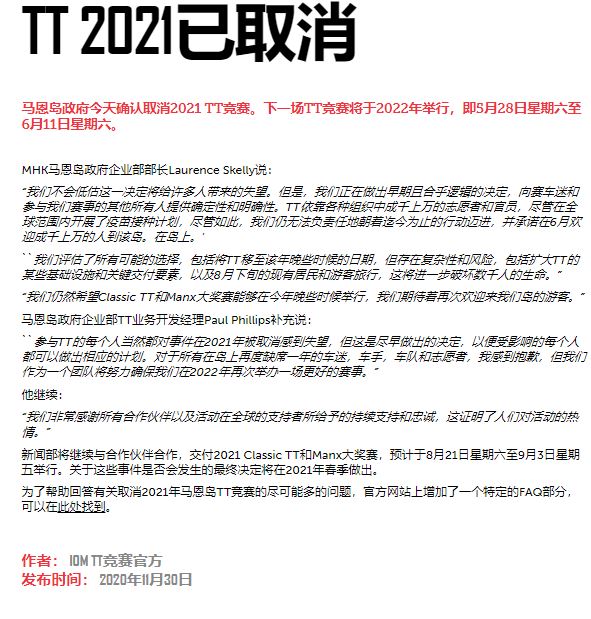 曼島組委會(huì)宣布 2021年TT大賽取消 同時(shí)公布2022年時(shí)間表