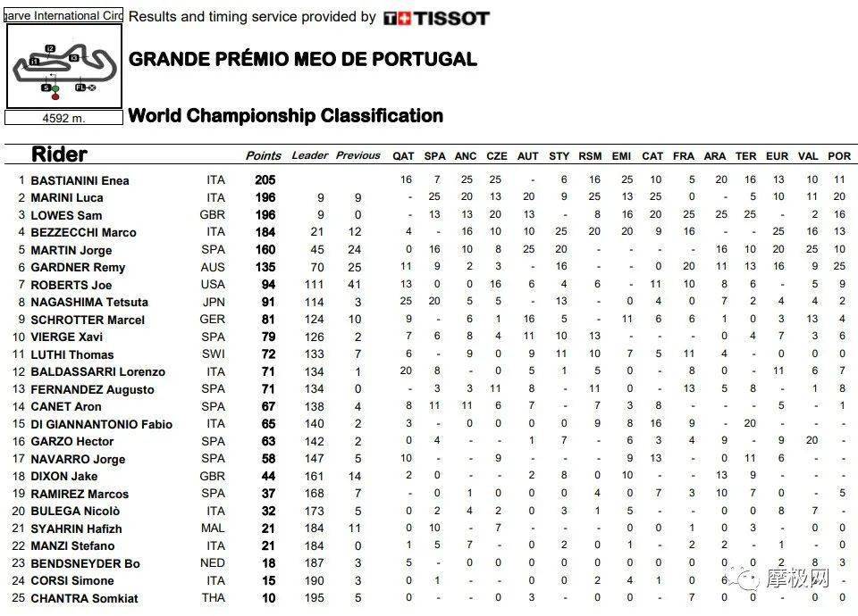新任Moto2世界冠軍Enea Bastianini第二度出戰(zhàn)Moto2(2019年奪得第10名),今年季初開(kāi)始展現(xiàn)王者氣勢(shì),他在季中至季尾保持著平穩(wěn)表現(xiàn)而奪標(biāo)。事實(shí)上,多位對(duì)手包括羅西的同母異父兄弟—MARINI Luca、Sam Lowes及BEZZECCHI Marco,在車(chē)手榜咬著Enea Bastianini不放,因此要斗到最后一站才分出勝負(fù)。除了Enea Bastianini在2021年登陸DUCATI MotoGP衛(wèi)星車(chē)隊(duì)之外,勁敵MARINI Luca同樣在2021年加盟DUCATI MotoGP衛(wèi)星車(chē)隊(duì)。