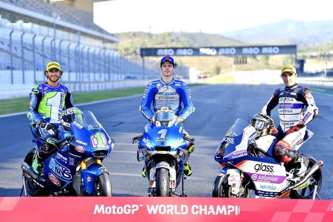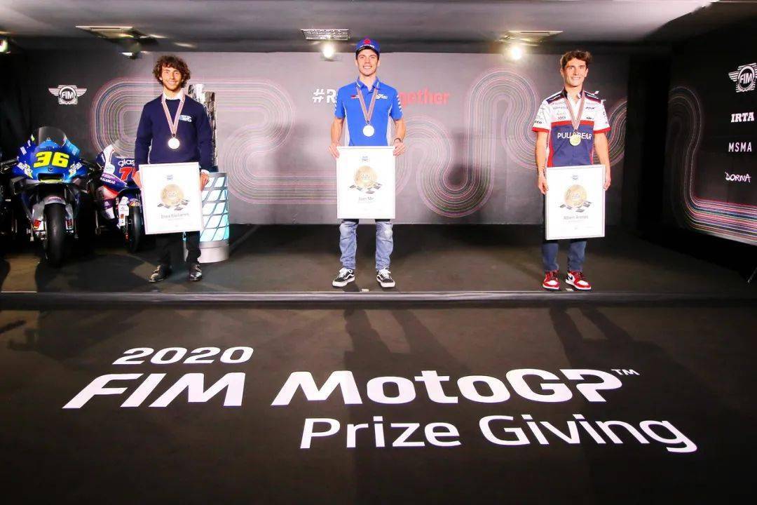 下面的圖片,F(xiàn)IM 2020' MotoGP 三個級別的年度總冠軍(下圖 1 左起,Moto2 級別世界冠軍 Enea Bastianini 巴斯蒂尼亞、MotoGP 級別世界冠軍 Joan Mir 米爾、Moto3 級別世界冠軍 Albert Arenas 阿里納斯)。