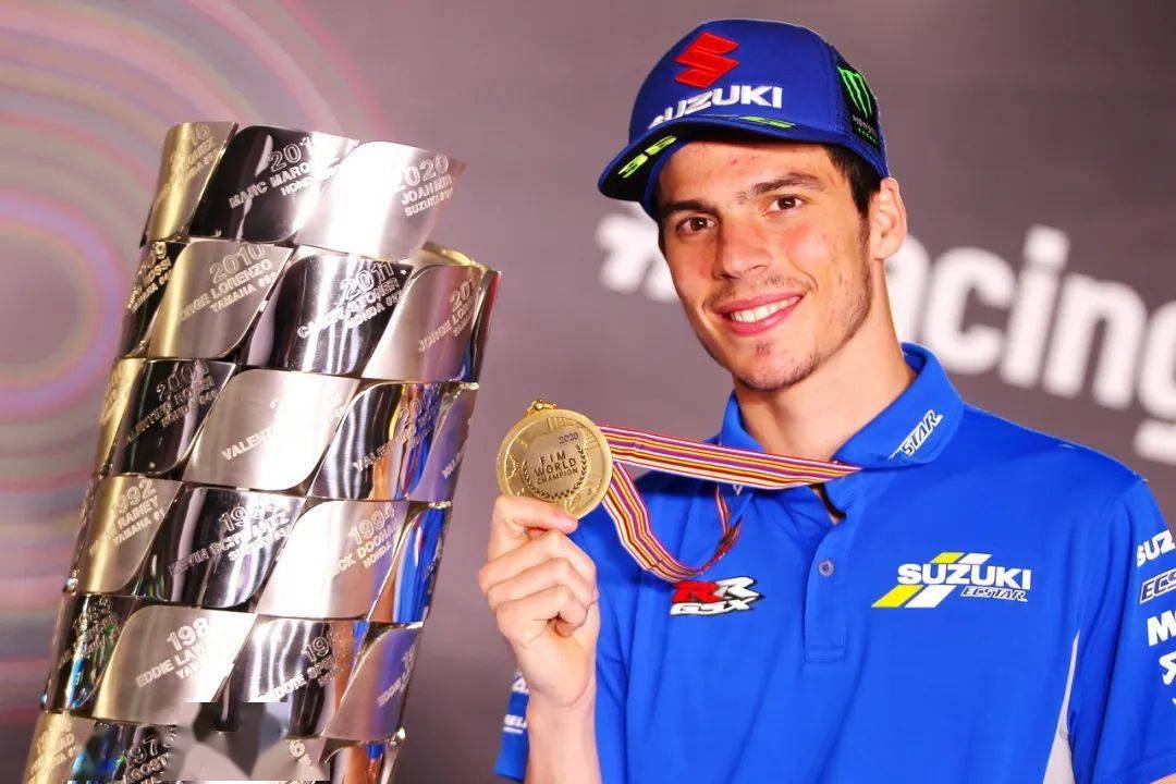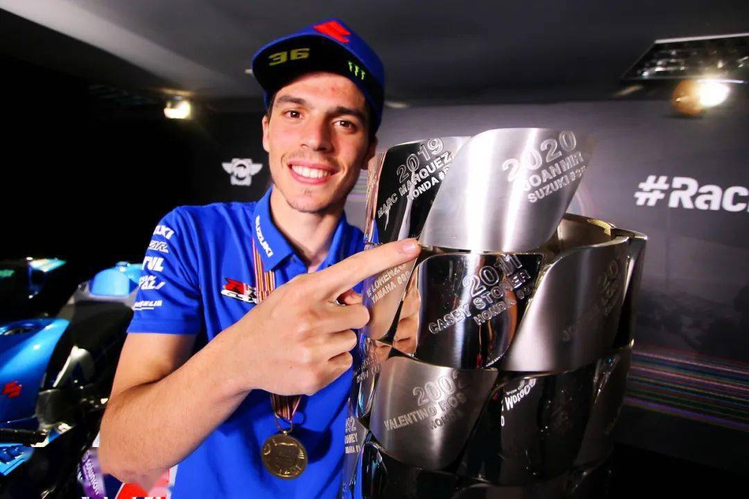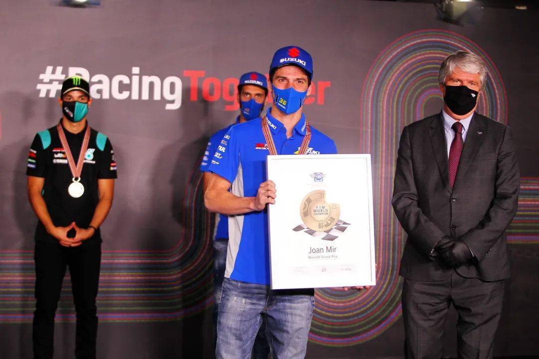 下面的圖片,F(xiàn)IM 2020' MotoGP、MotoGP 級別的車手年度總冠軍米爾(Joan Mir),以及其他不同獎項的年度勝利者(MotoGP 級別年度前三、車隊年度冠軍等)。