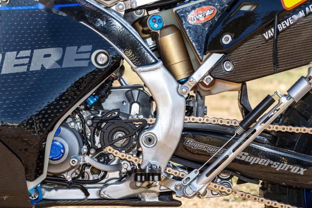 WR450F Rally 工廠賽車(chē)的車(chē)架基于基礎(chǔ)車(chē)原有的鋁合金雙翼樑型式,但采用了更長(zhǎng)的(加長(zhǎng)了 2 cm)的后搖臂,以提高在高速之下的車(chē)輛穩(wěn)定性、同時(shí)又能保持 WR450F 基礎(chǔ)車(chē)所具有的中性騎乘位置。特制的油箱容量達(dá) 33 公升,安裝位置也經(jīng)過(guò)重新設(shè)計(jì),以避免影響車(chē)手在騎行過(guò)程中的身體移動(dòng)。