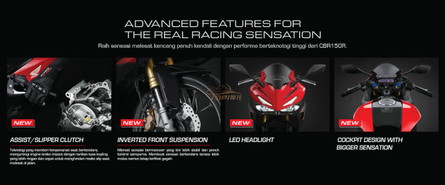 新的CBR150R發(fā)動機,仍然使用與老款相同的動力平臺,149cc排量的單缸水冷發(fā)動機,最大功率為17.1 PS/9,000 rpm,最大扭矩14.4 Nm/7,000 rpm,唯一的改變是加入了輔助滑動離合。