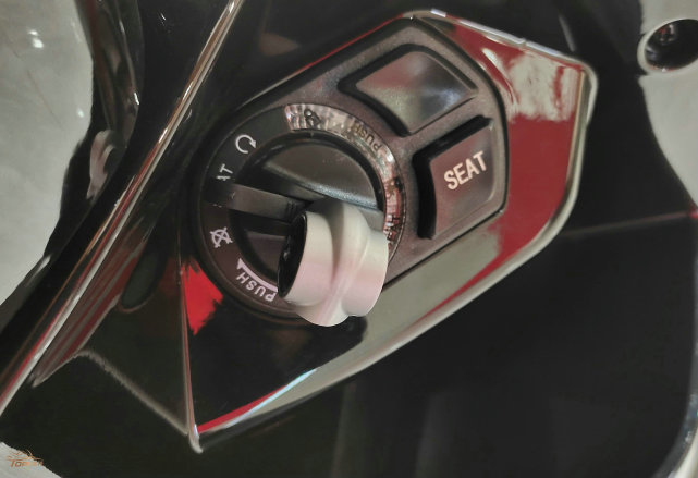 受制于車身尺寸,坐桶空間并不大,只能放下一頂半盔,加油的時(shí)候需要打開(kāi)后座,同時(shí)油箱蓋有防丟設(shè)計(jì)。