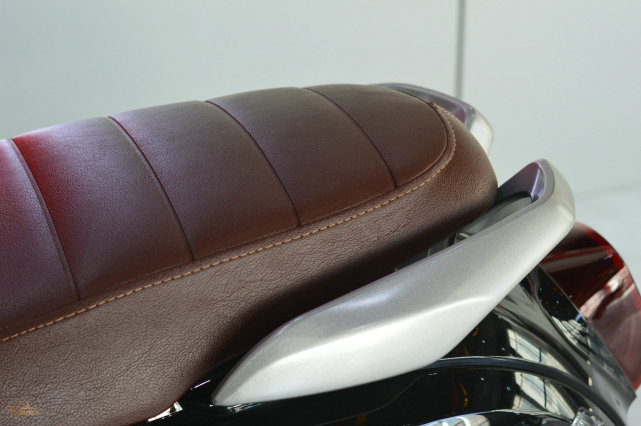 棕褐色的皮革坐墊,采用復(fù)古摩托車上常見(jiàn)的“毛毛蟲(chóng)”樣式,看上去頗有檔次感,而且厚度不錯(cuò),能夠提供一定的乘坐舒適度。