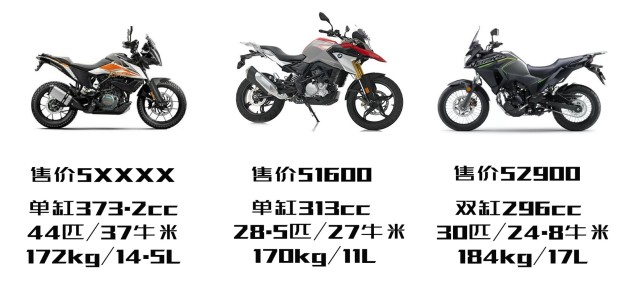 從上圖簡(jiǎn)單的數(shù)據(jù)來(lái)看,KTM 390 ADV確實(shí)具備較大的優(yōu)勢(shì),首先排量是最大的,自然而然動(dòng)力方便也是最強(qiáng)的,如果最終的價(jià)格也在5W-5.5W之間的話,性價(jià)比確實(shí)挺高的。另外兩個(gè)對(duì)手是不是就一無(wú)是處呢?當(dāng)然不是,寶馬的品牌和GS的外觀逼格較高,川崎X300是雙缸這也是優(yōu)勢(shì),即便價(jià)格相差都不大,它們也都有自己的消費(fèi)群體。