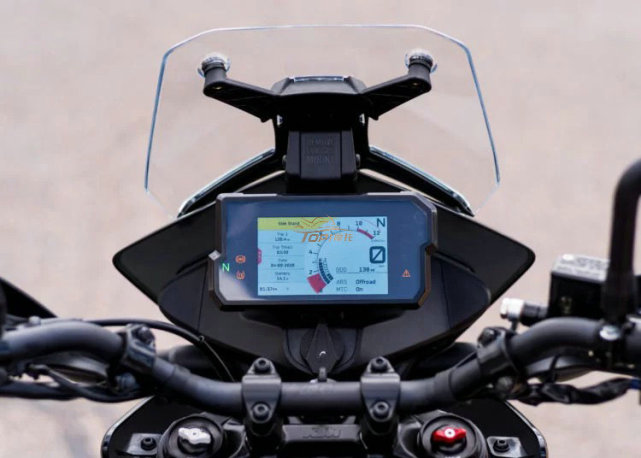 配置方面的看點(diǎn)比較多:標(biāo)配滑動(dòng)離合器,電子油門,完全可調(diào)節(jié)WP前后避震,全彩TFT儀表(MY RIDE功能),MTC牽引力控制,越野+彎道ABS(可單獨(dú)關(guān)閉后輪),還可以選裝快速換擋系統(tǒng)和天蝎排氣,甚至是條幅輪圈。