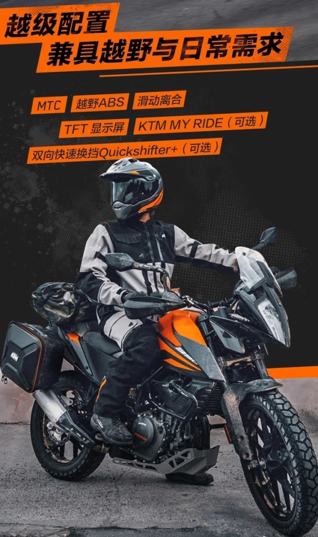 包括:電子油門、滑動(dòng)離合器、前后可調(diào)節(jié)的WP避震、博世雙通道ABS(包括彎道ABS和越野ABS功能)、MTC牽引力控制系統(tǒng)、全彩TFT儀表(可選藍(lán)牙互聯(lián)功能)、可選裝快速換擋、之后可能還會(huì)有可選裝的鋼絲條幅輪圈(國外已經(jīng)推出)。這個(gè)配置放在5萬出頭這個(gè)價(jià)位,對(duì)國內(nèi)車友的吸引力不是一般的大。