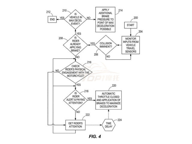 因此,在過去三年中,哈雷的自動(dòng)剎車系統(tǒng)至少已獲得三項(xiàng)專利,申請(qǐng)和兩項(xiàng)已獲授權(quán)的專利,該系統(tǒng)進(jìn)行了一系列檢查,使用傳感器來判斷騎手的知覺和坐姿,然后再進(jìn)行下一步操作。自動(dòng)緊急制動(dòng)操作,首先檢查騎手是否已經(jīng)在剎車。如果答案是“是”,但系統(tǒng)判斷自行車可能會(huì)更努力制動(dòng)(許多騎手并沒有意識(shí)到如果需要的話,摩托車可以停下來多快),它將施加更大的制動(dòng)力,直到達(dá)到最大潛在減速度為止。
