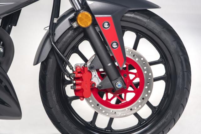 配備組合式制動(dòng)系統(tǒng)(CBS),前后均為單碟剎,也都配備雙活塞卡鉗,前制動(dòng)盤(pán)276mm,后制動(dòng)盤(pán)220mm,該車(chē)重量136kg,軸距1,330mm,座高785mm。