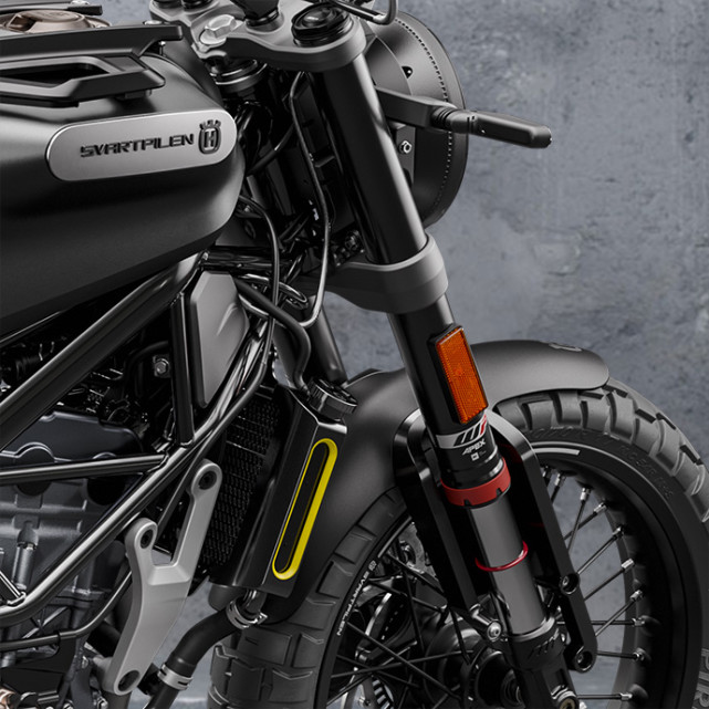 前叉是WP APEX倒立式前叉,具有43mm直徑和142mm行程,中置單避震由縱桿連接到后搖臂,并具有漸進(jìn)式螺旋彈簧,行程為142mm。車把和前叉板均采用鍛造鋁制成,筆直的車把具有越野樣式的立管,使Svartpilen 125的騎行姿勢(shì)更高并且更具侵略性。