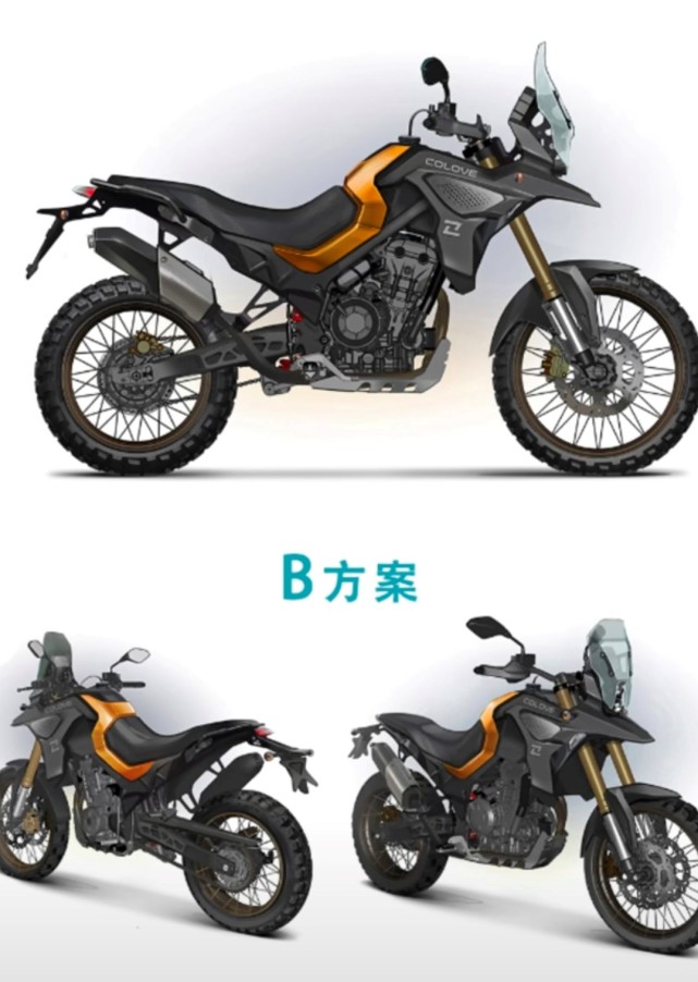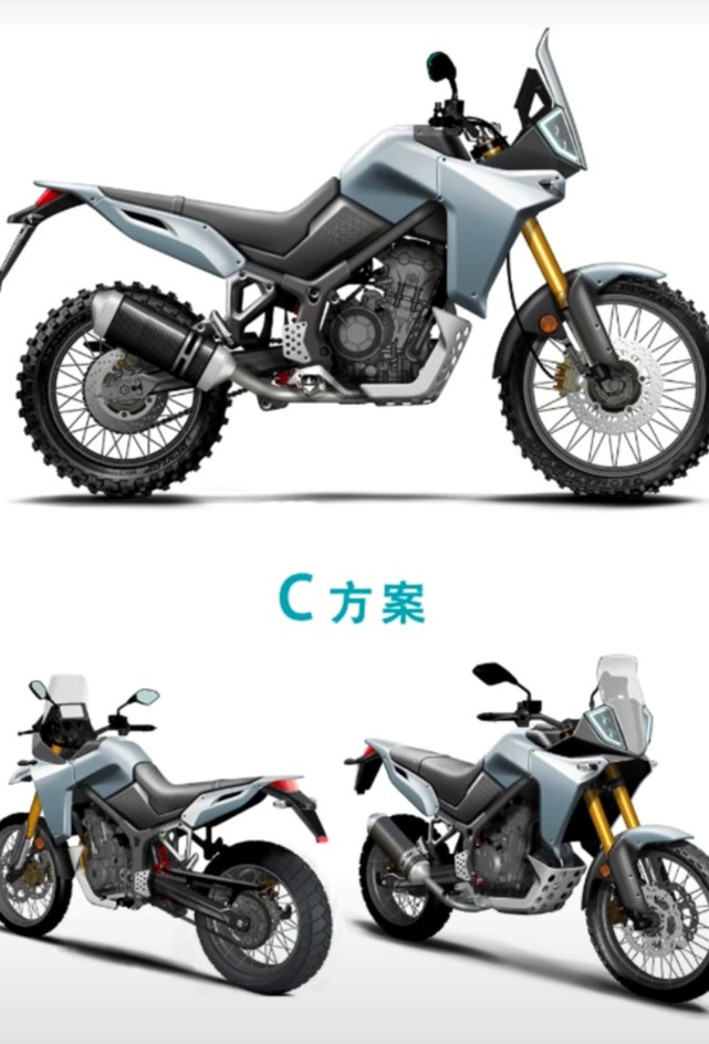 C方案就有些另類,大致輪廓有點像達喀爾拉力賽車的風格,特別是前大燈很有KTM“刀疤臉”的既視感,我個人覺得C方案應該是最不受待見的一款,國內(nèi)車友還是比較期待原創(chuàng)作品的。