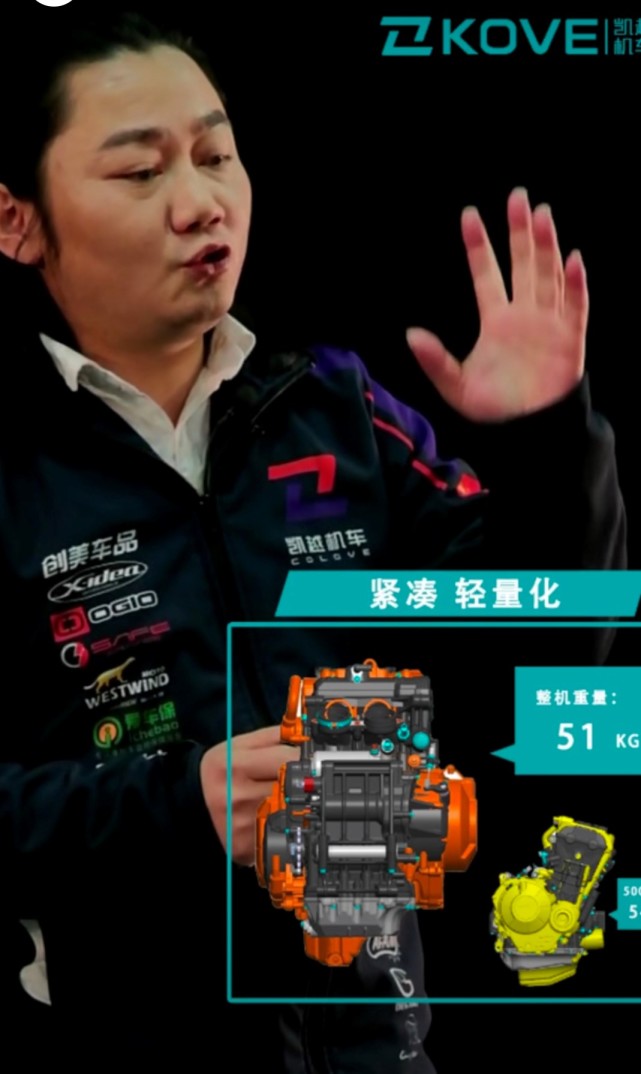 這一次的重點是這臺799cc排量的,水冷并列雙缸發(fā)動機。配備一系列先進設(shè)計:75度曲軸兼顧動力、低扭和聲浪,雙平衡軸(曲軸、凸輪軸)震動抑制出色;干式油底殼 、雙機油泵 、漲斷連桿工藝、鍛造活塞(石墨涂層減小摩擦);鎂合金氣缸蓋、空心變擋軸 、分體式凸輪軸、俯沖式進氣道、DLC涂層輕型指搖臂、等離子噴涂氣缸、齒輪噴淋潤滑設(shè)計 。發(fā)動機重量只有51kg,比隆鑫KE500發(fā)動機還輕3kg,但是關(guān)于這臺發(fā)動機最關(guān)鍵的輸出數(shù)據(jù)卻沒有公布。