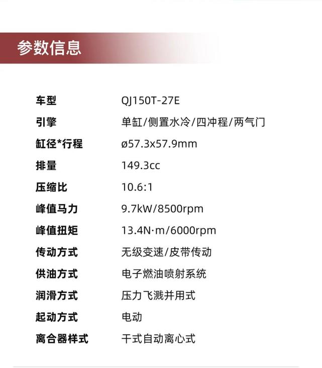 QJMOTOR菲諾是125排量(6.3kw/9Nm),這一款壹米則配備了150排量的發(fā)動機,最大功率9.7kw/8500rpm,最大扭矩13.4Nm/6000rpm,這個數(shù)據(jù)處于150級別中等偏上的水平,與菲諾125相比數(shù)據(jù)明顯強了一大截。