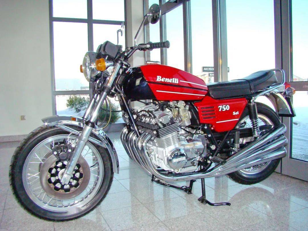 下面的圖片,貝納利在 1974 年推出的、搭載一副四沖程直列六汽缸發(fā)動機(jī)的 750 SEI(資料圖片)。