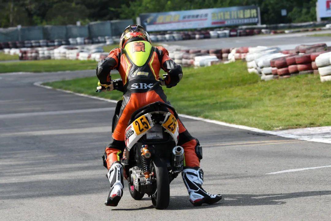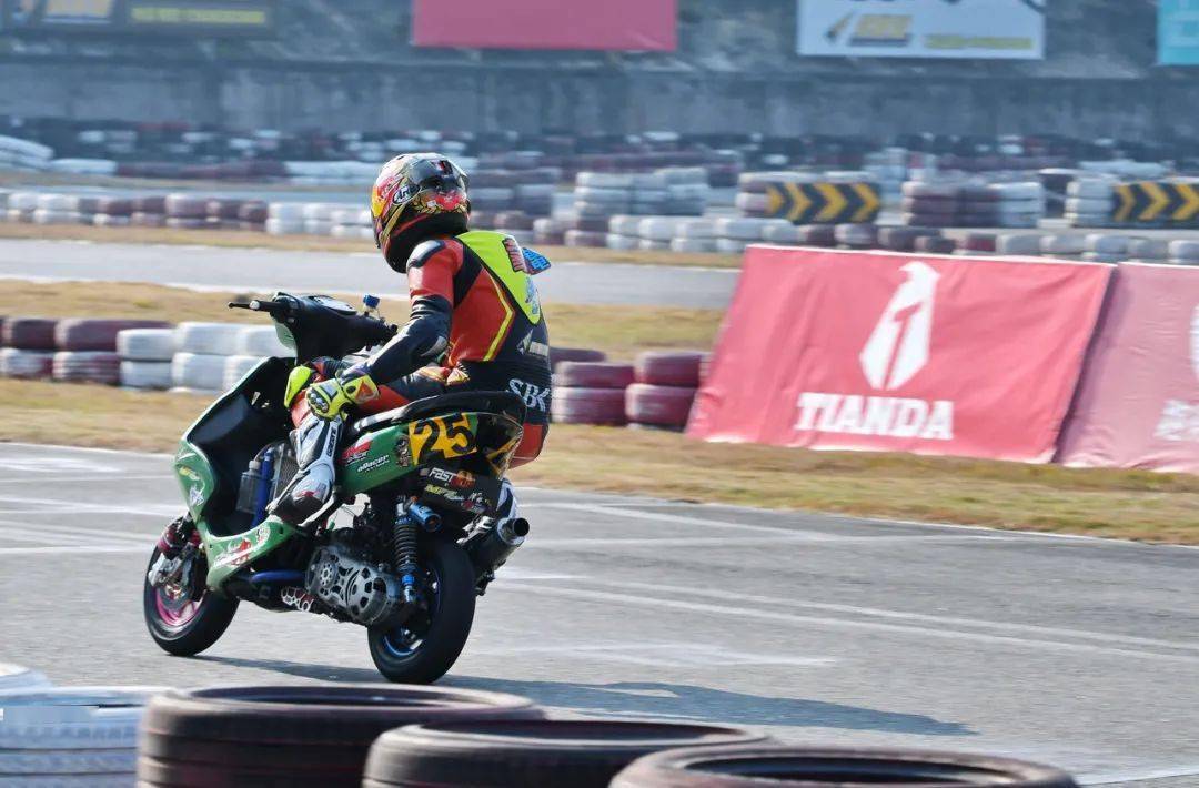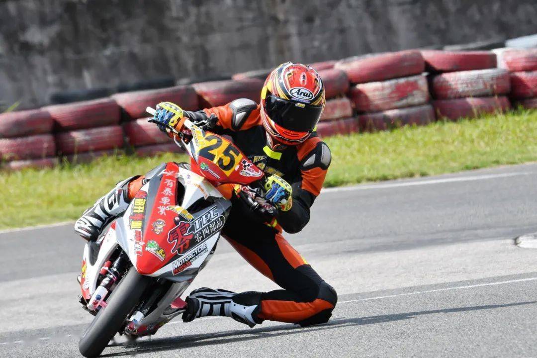 艾瑞森輪胎改裝踏板 150 cc 公開組,駕駛 25 號車的方洛榮,是今年才正式從踏板新人組升級而來的新挑戰(zhàn)者。賽前的兩節(jié)計時練習(xí)(排位賽)里,賽車還在不斷調(diào)校中的他,跑出的最快圈速是 55.681 秒,正賽起步、排在了隊伍的較后位置。