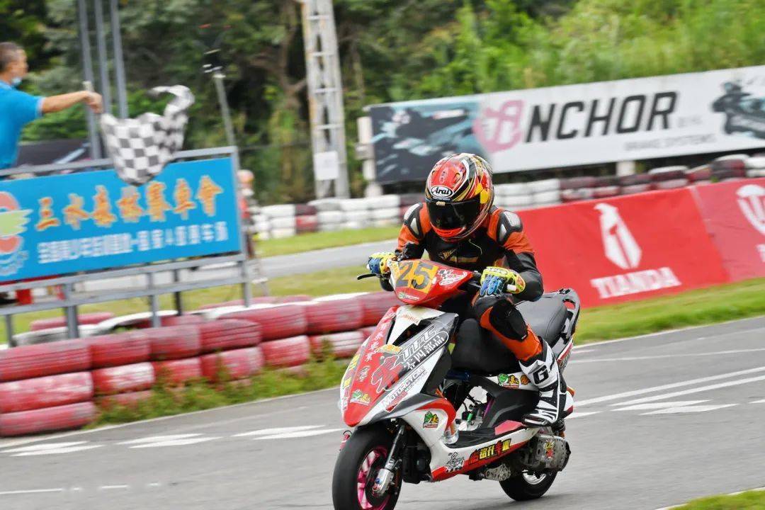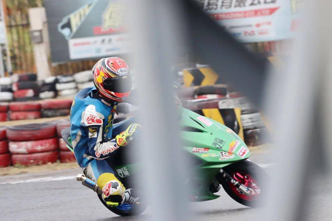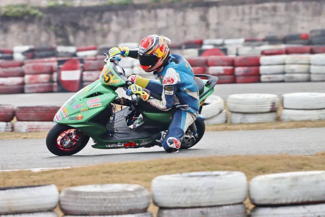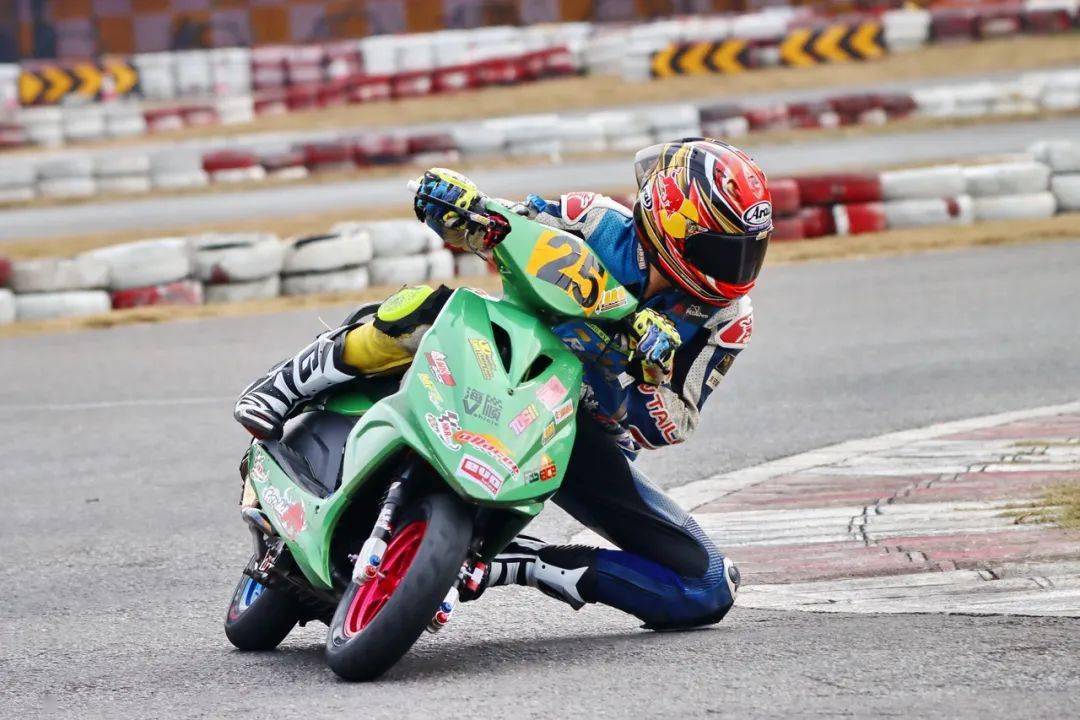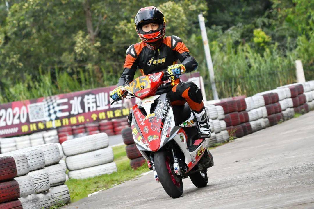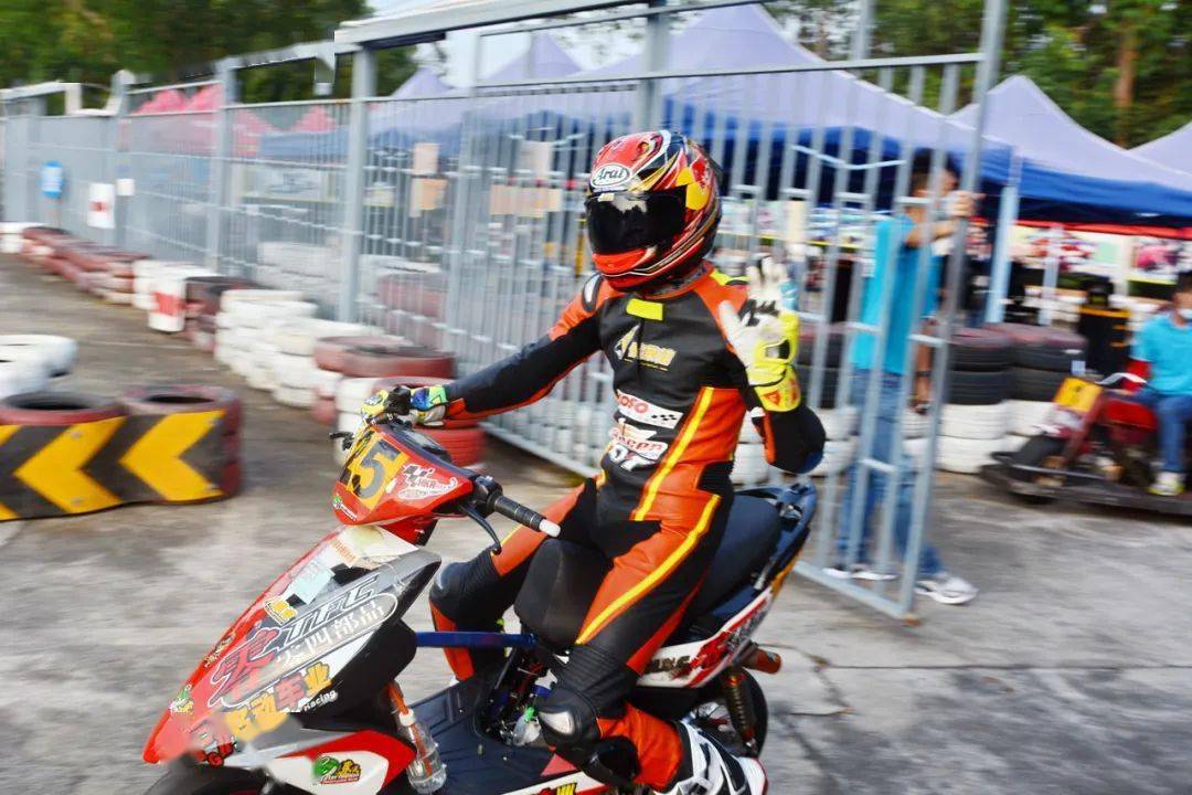 下面的圖片,參與到 2020 年度三水偉業(yè)達杯、艾瑞森輪胎改裝踏板 150 cc 公開組比賽中的方洛榮。