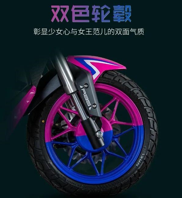 女王版的配色采用非常潮流的紫粉色搭配白色和藍色組成,整個呈現(xiàn)出來的風格很像“夜店風”,包括后視鏡、輪圈、以及后扶手都有上色。