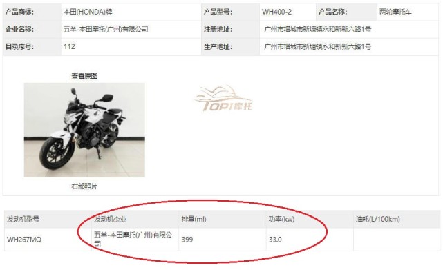 核心提示:除了CB400X之外,五羊本田還帶來了另外一個驚喜,CB400X同平臺的街車CB400F,從申報信息當中能夠看到,這款產(chǎn)品型號為WH400-2的