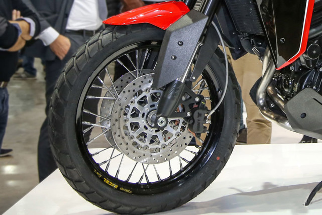 前110 / 80-19,后150 / 70-17的輪胎規(guī)格,配備鋼絲輻條輪圈和多功能輪胎,前300mm雙盤后255mm單盤,搭配Nissin雙活塞卡鉗。