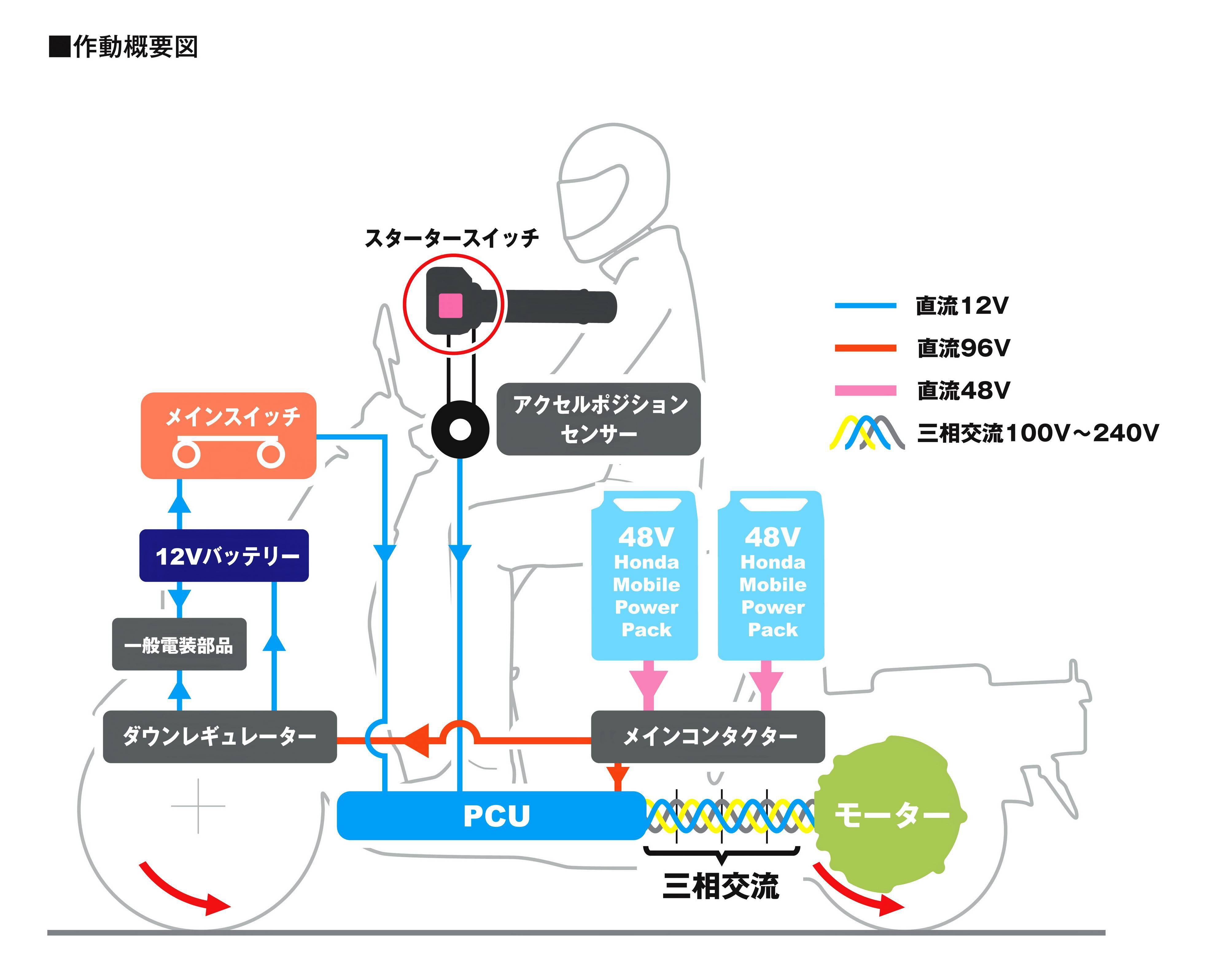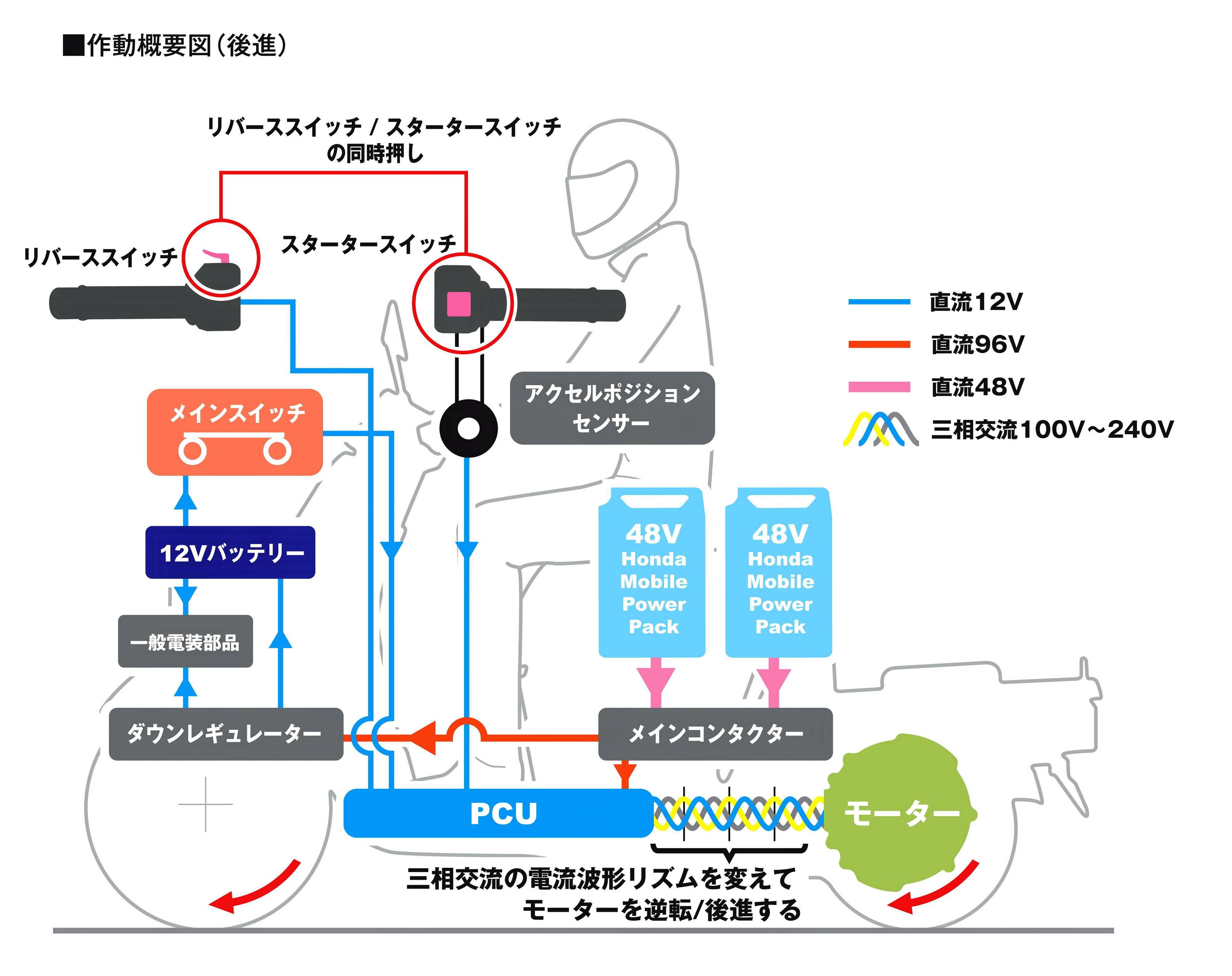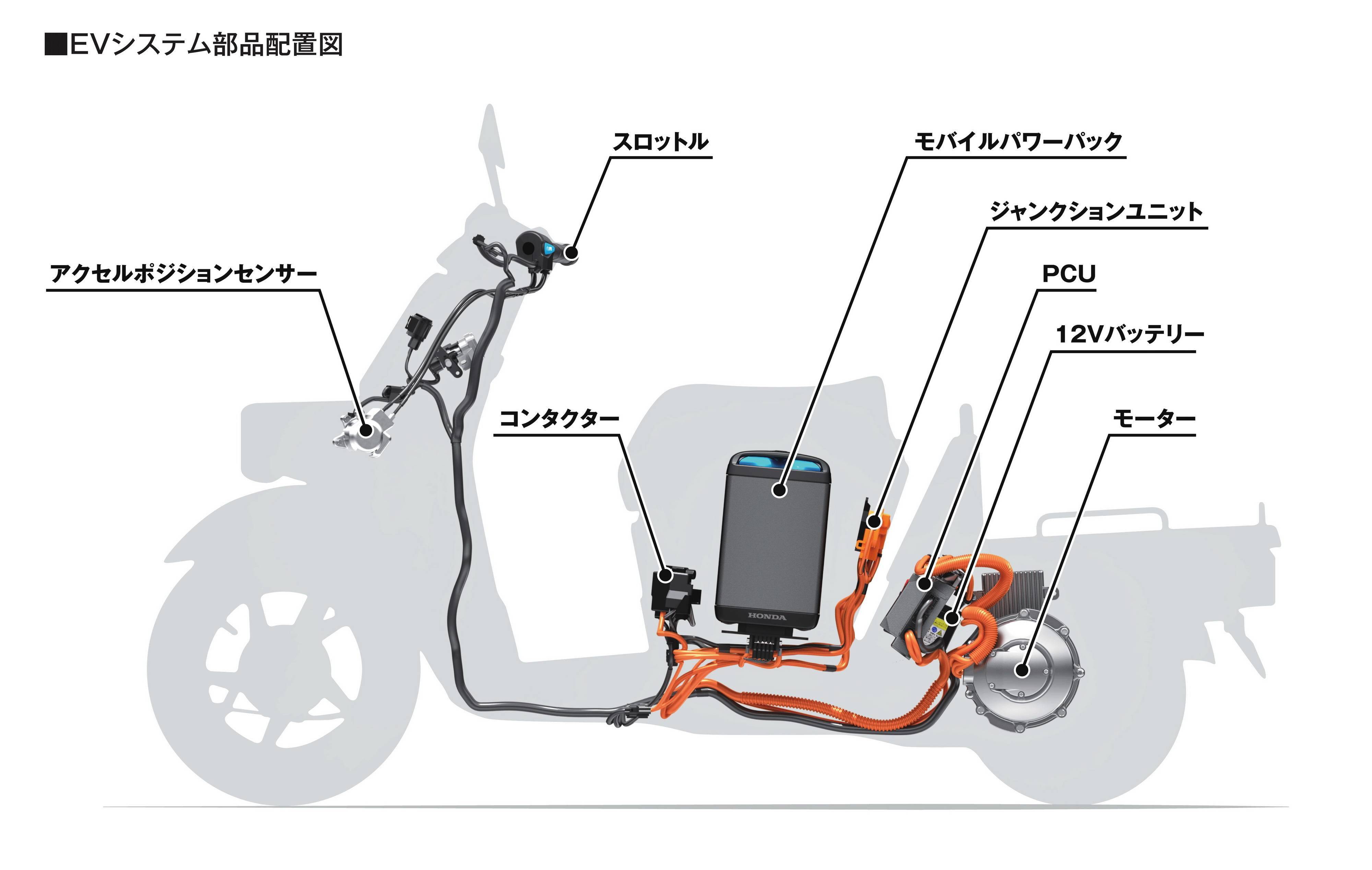 新的 GYRO e 以一個(gè)峰值功率為 3.2 kw(約 4.4 匹)的電機(jī)作動(dòng)力來(lái)源,兩個(gè)與電動(dòng)踏板 PCXe:HEV 上所采用的、相同的可移動(dòng)電池組(Honda Mobile Power Pack),兩個(gè)電池組采用串聯(lián)連接的方式、以 96V 的電壓為系統(tǒng)提供電力,用功率控制單元(PCU)將該電力轉(zhuǎn)換成三相交流,供給電力到馬達(dá)、從而獲取驅(qū)動(dòng)力。