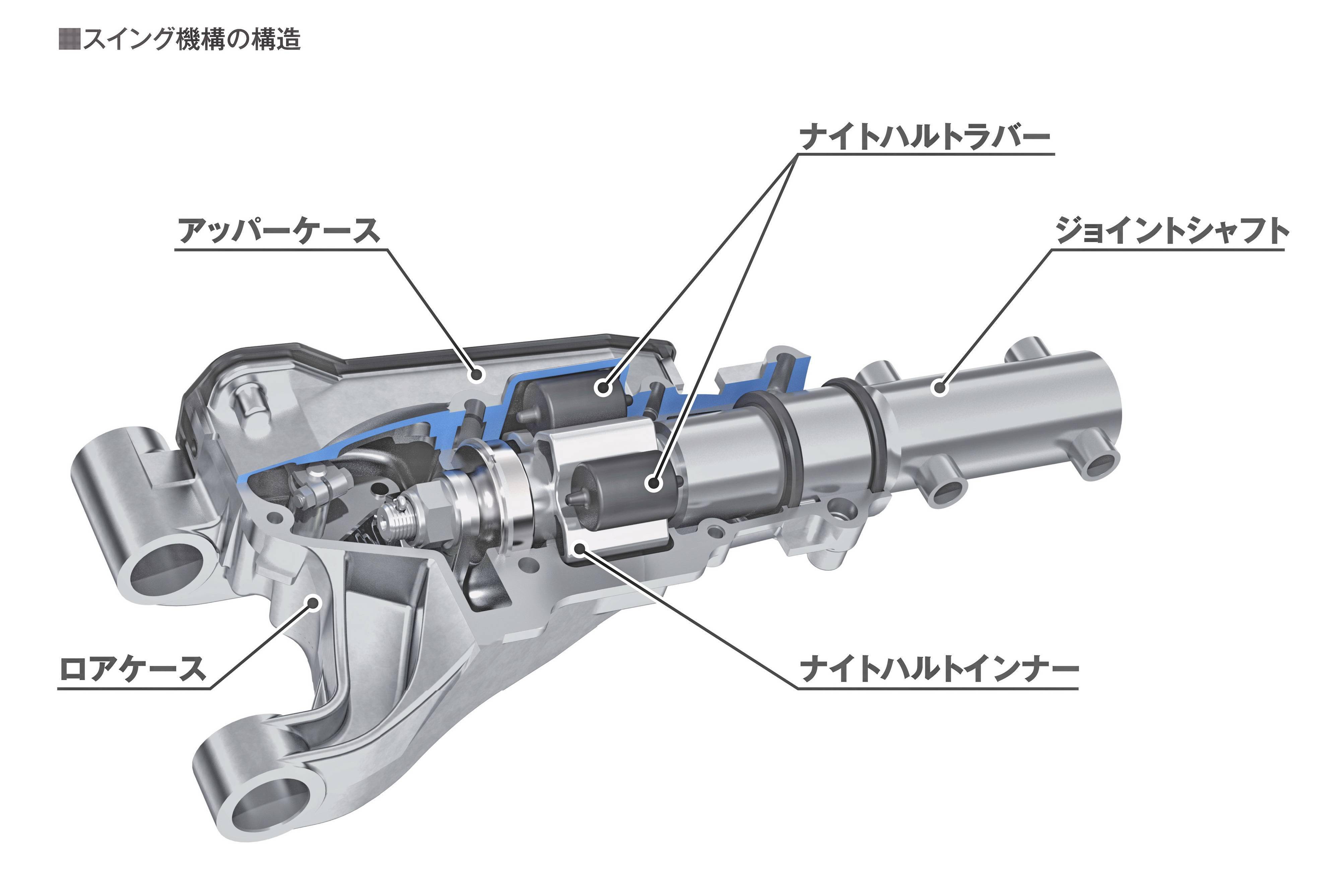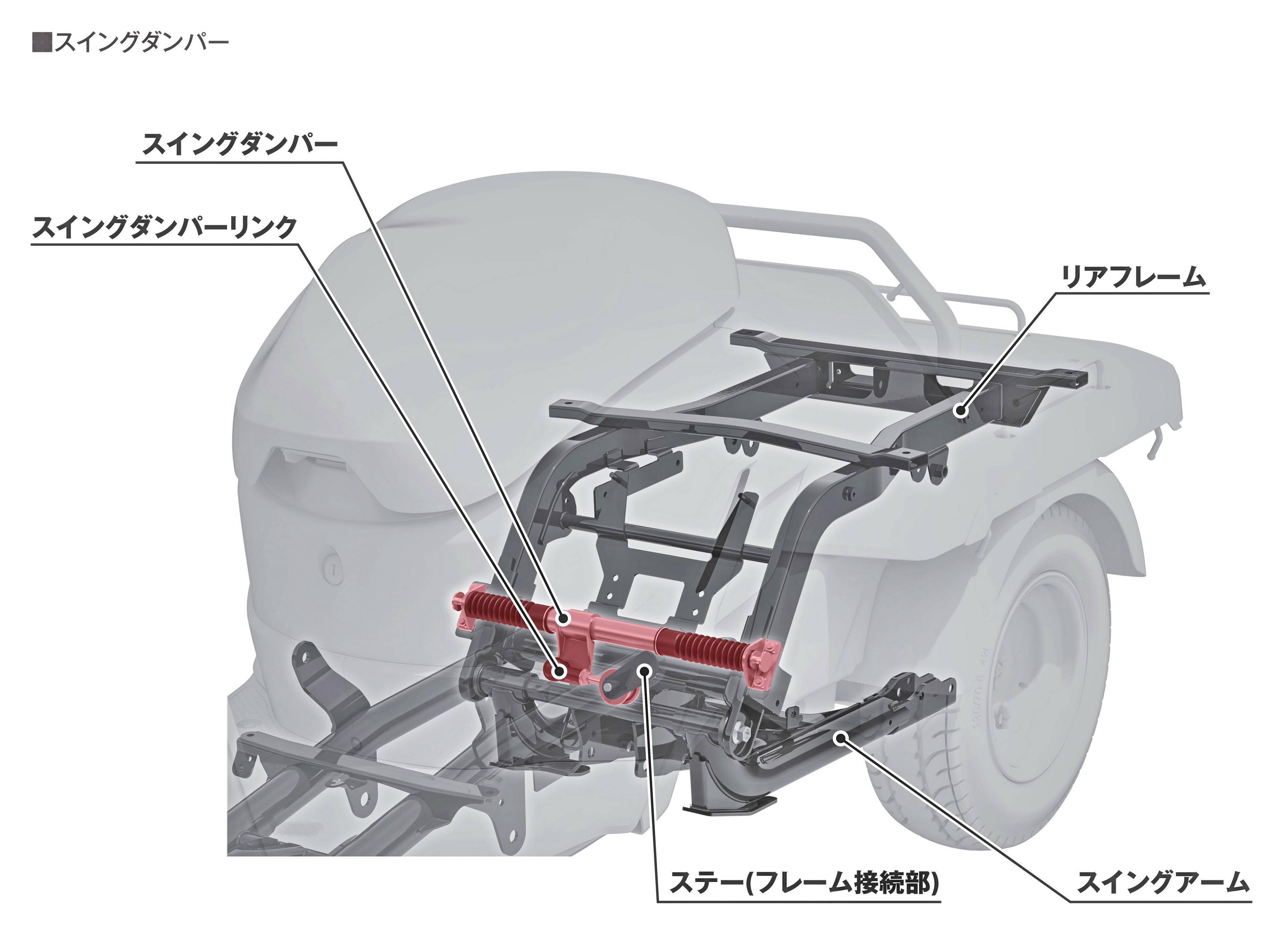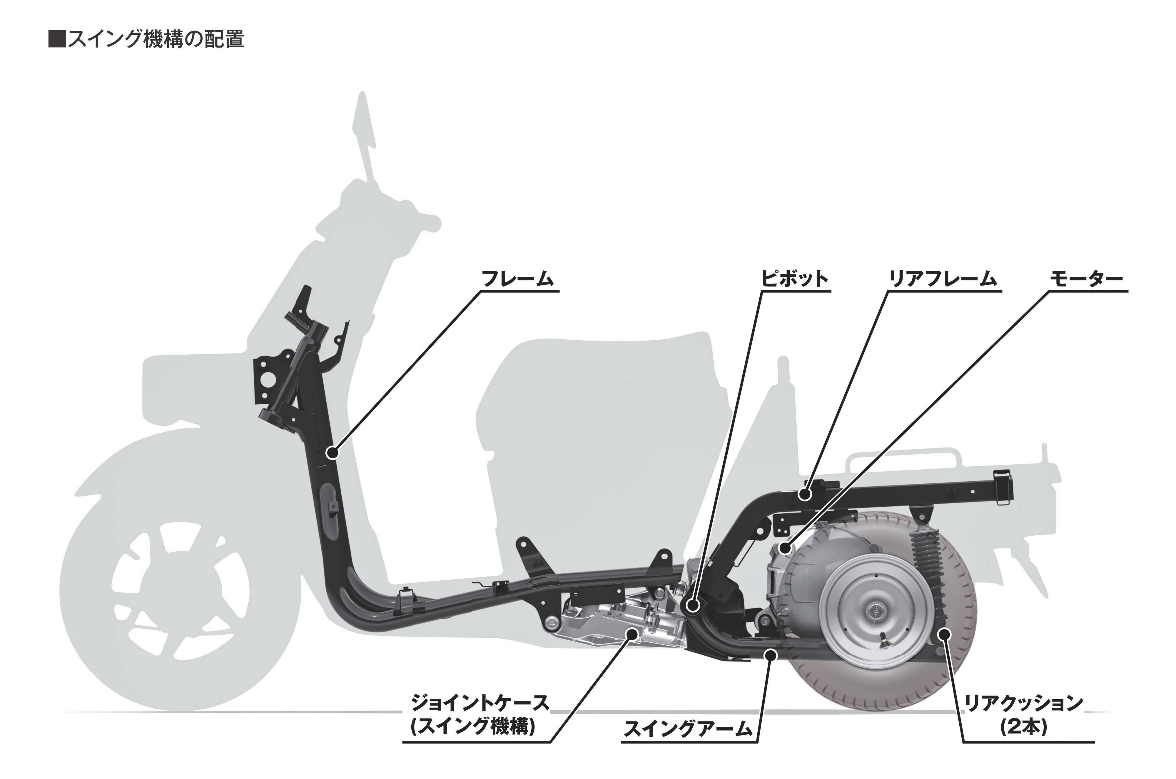 為了讓車輛在轉(zhuǎn)向的時(shí)候,后廂仍能處于與地面平行的狀態(tài),車體前部和后部的連接、采用了額外的擺動(dòng)機(jī)構(gòu)。為了調(diào)整轉(zhuǎn)向時(shí)、后輪產(chǎn)生的左右旋轉(zhuǎn)差,配備與主軸處于同軸狀態(tài)的差速齒輪,提供了讓人更具安心感的駕駛。