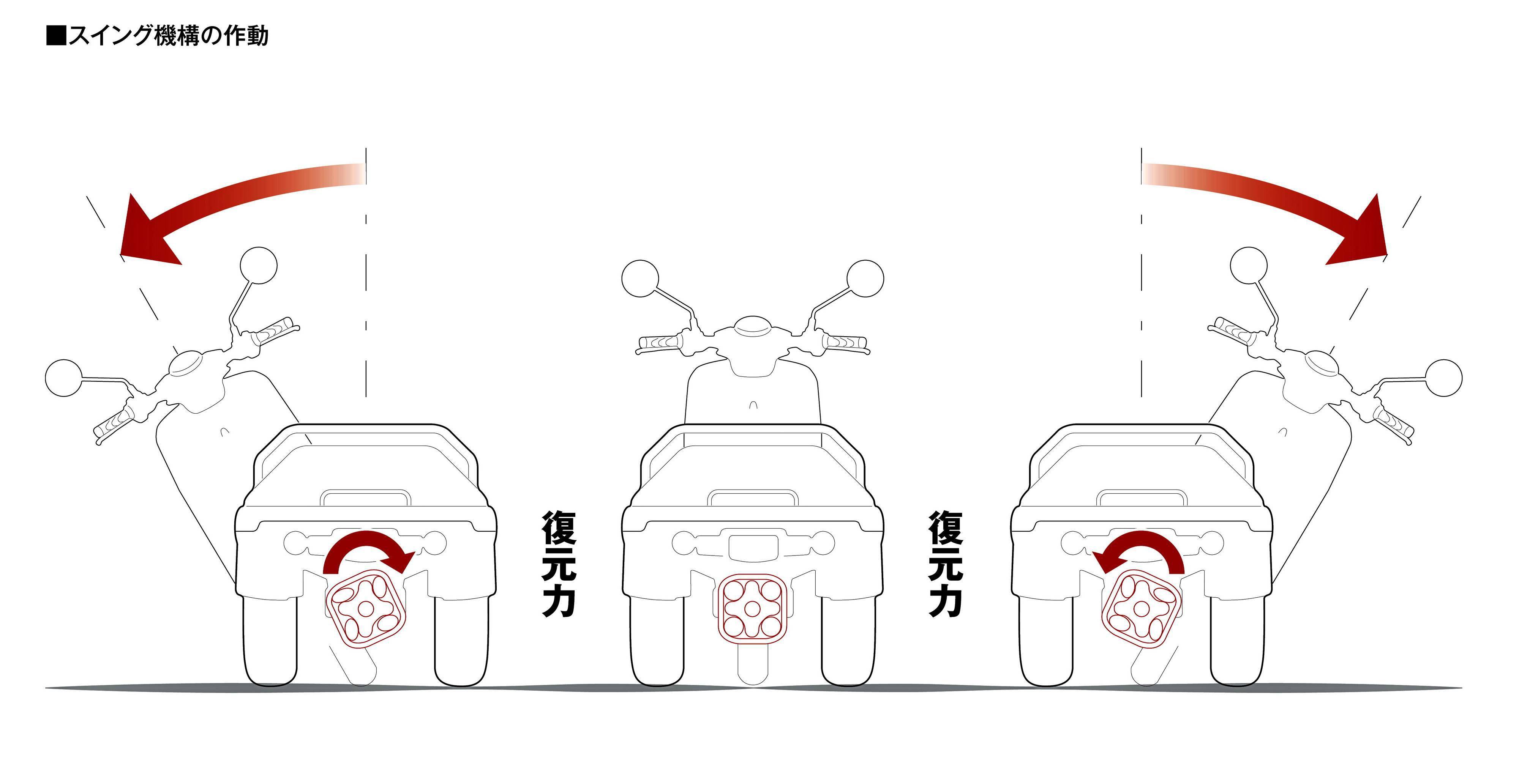 下圖:GYRO e 車體前部與后部連接的擺動(dòng)機(jī)構(gòu)和動(dòng)作示意圖。