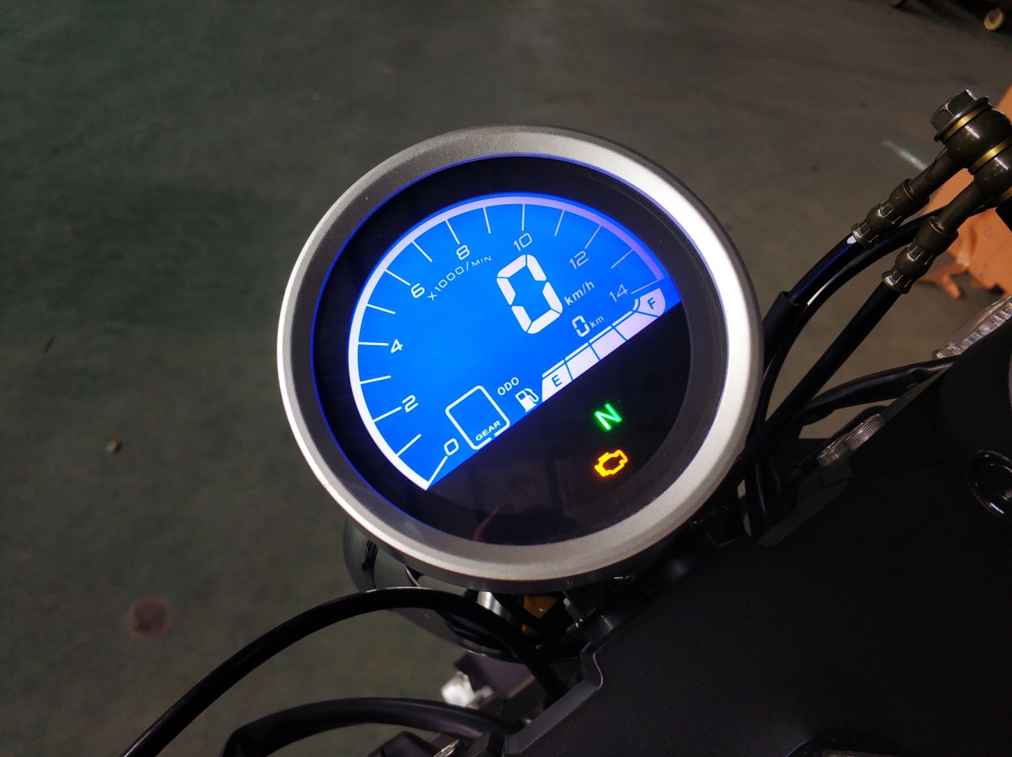 圓形的全液晶儀表采用銀色的外圈點(diǎn)綴,藍(lán)色背光白色字體清晰細(xì)膩辨識(shí)度高,雖然很多國(guó)產(chǎn)復(fù)古摩托都在使用類似的設(shè)計(jì),但是這塊儀表整體表現(xiàn)屬于上乘的水準(zhǔn)。