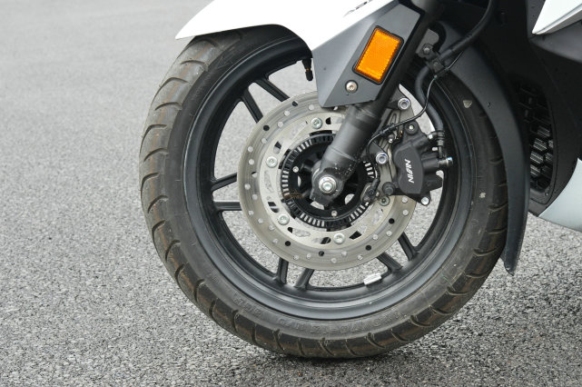 NSS350座高780mm,看上去不怎么高,但是只有坐上去之后,你才會發(fā)現(xiàn),因為坐墊比較寬,導致雙腳難以著地,身高173cm盡量靠前坐,也只能做到雙前腳掌著地,好在只有186kg的整備重量不算沉。