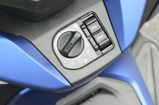無鑰匙啟動是標配,現(xiàn)如今已經(jīng)在大踏板當中成為不可或缺的一個配置,NSS350的無鑰匙系統(tǒng)非常簡單,整個邏輯比較的直觀,基本上看一遍就會,旋鈕旁邊是開啟加油口和坐墊的按鍵。