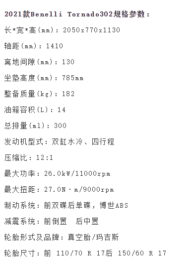 動(dòng)力方面,依然還是那臺(tái)300cc的并列雙缸水冷發(fā)動(dòng)機(jī),最大功率26.0kW/11000rpm,最大扭矩27.0N·m/9000rpm。但是需要注意的是Tornado 302的整備重量只有182kg,因此動(dòng)力的表現(xiàn)非常值得期待。