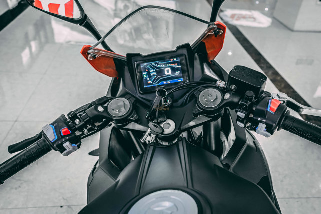 這塊全彩液晶儀表大家已經(jīng)非常熟悉了,已經(jīng)出現(xiàn)在多款錢江的車型上,手把按鍵采用當(dāng)下流行的LED背光模組,還有角度可調(diào)的拉桿。