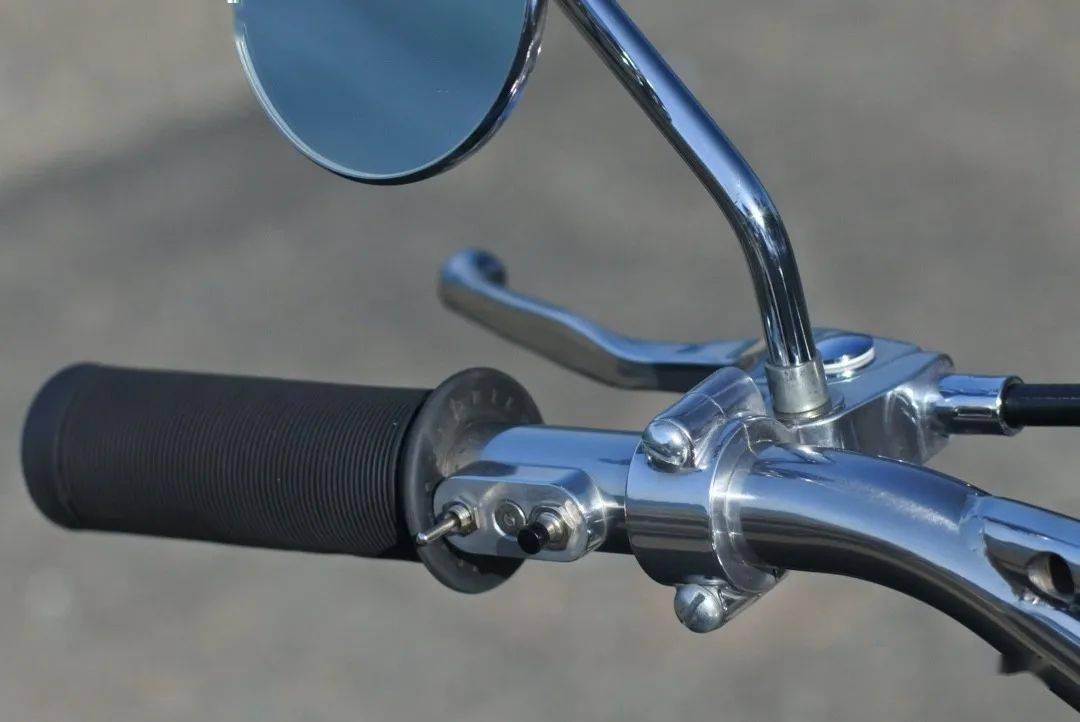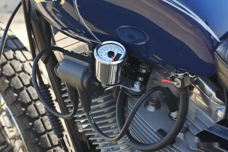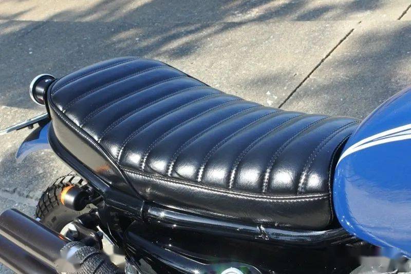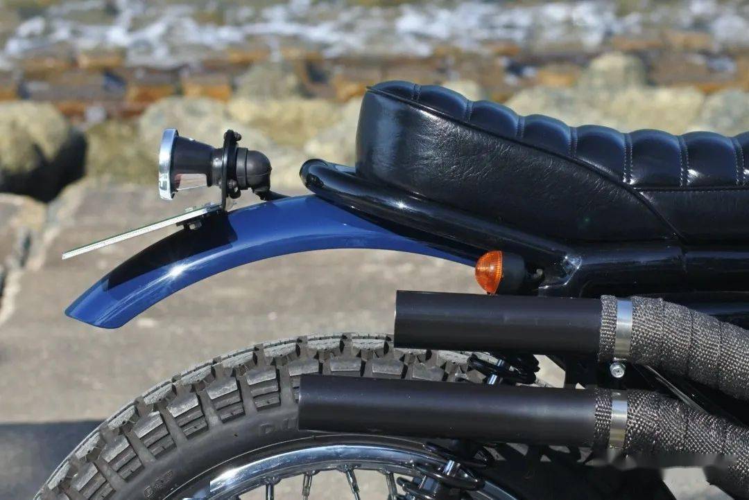 在這部作品上,改裝團(tuán)隊(duì)使用了來自川崎W650的油箱,18寸的越野車輪轂,335mm行程的懸掛,還把原車的皮帶傳動(dòng)改換為530型號(hào)的鏈條傳動(dòng)。在這臺(tái)車上最好看的細(xì)節(jié)當(dāng)屬位于它車身右側(cè)的高位雙出排氣,對(duì)老車有了解的朋友一眼就能看出,它幾乎與老式的Triumph scrambler如出一轍,而這也是改裝者Takeshi本人最喜歡的設(shè)計(jì)。