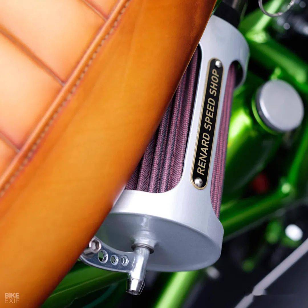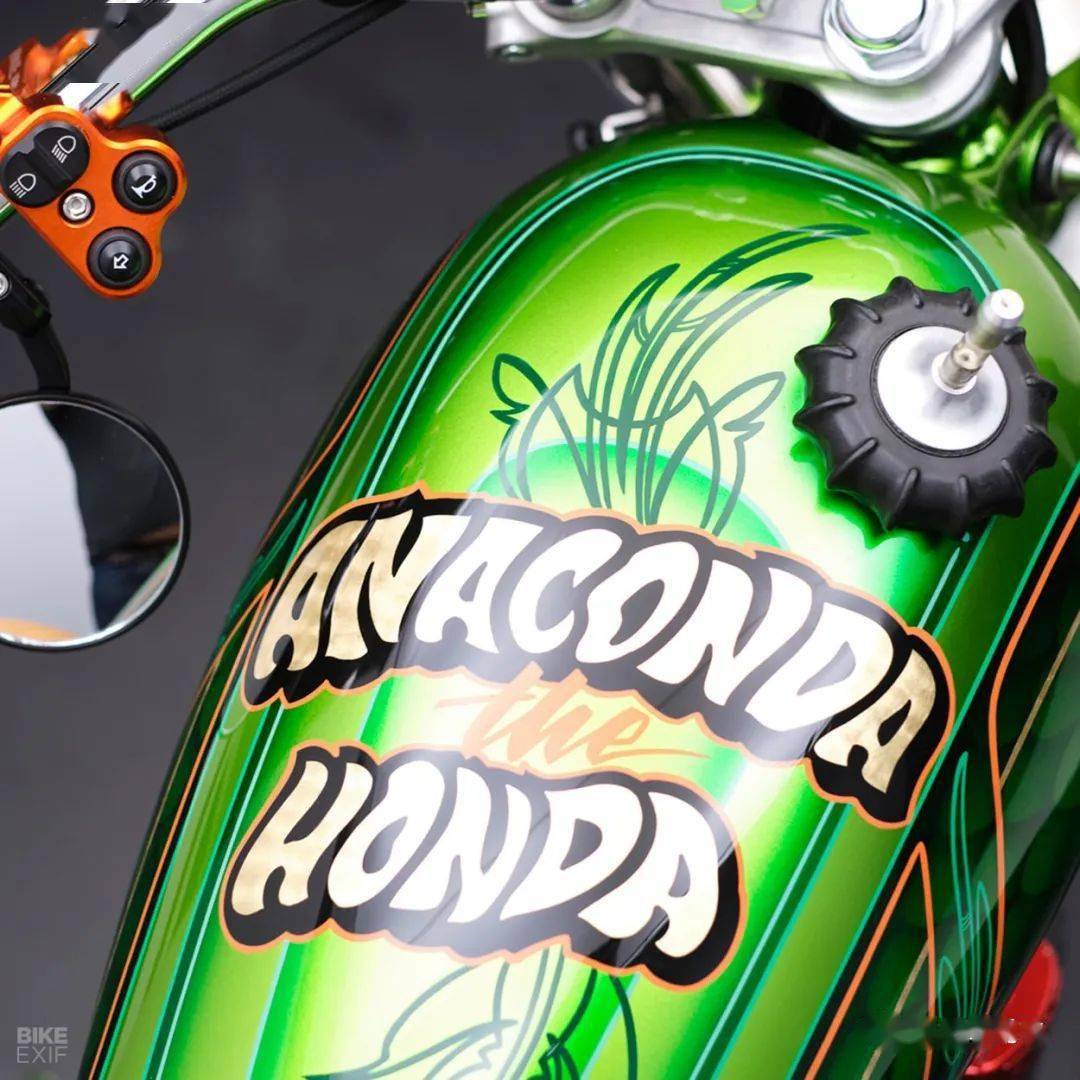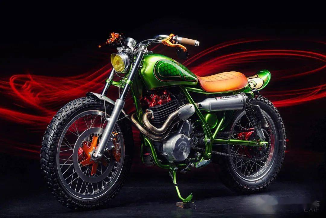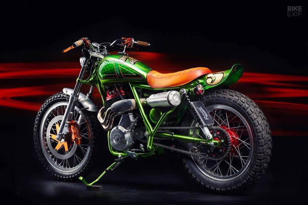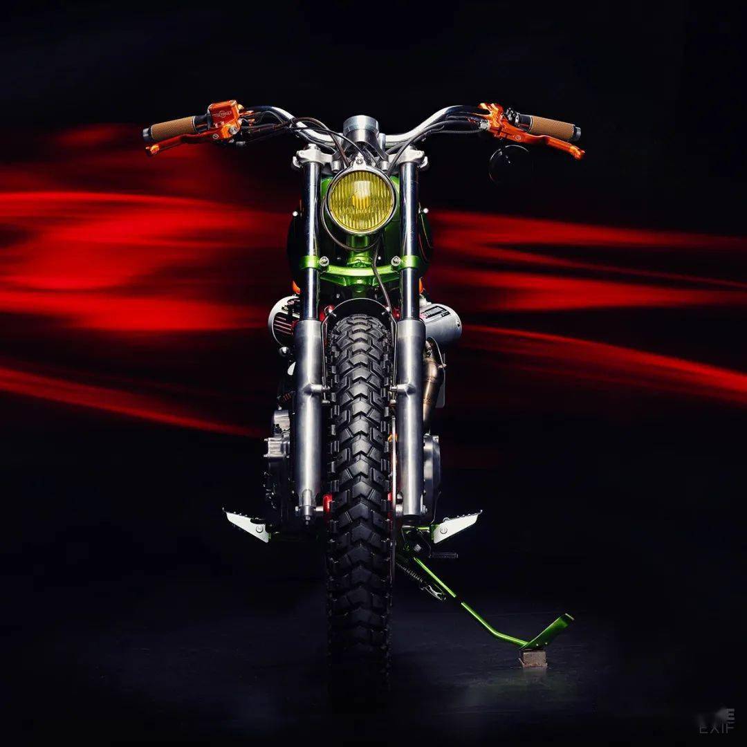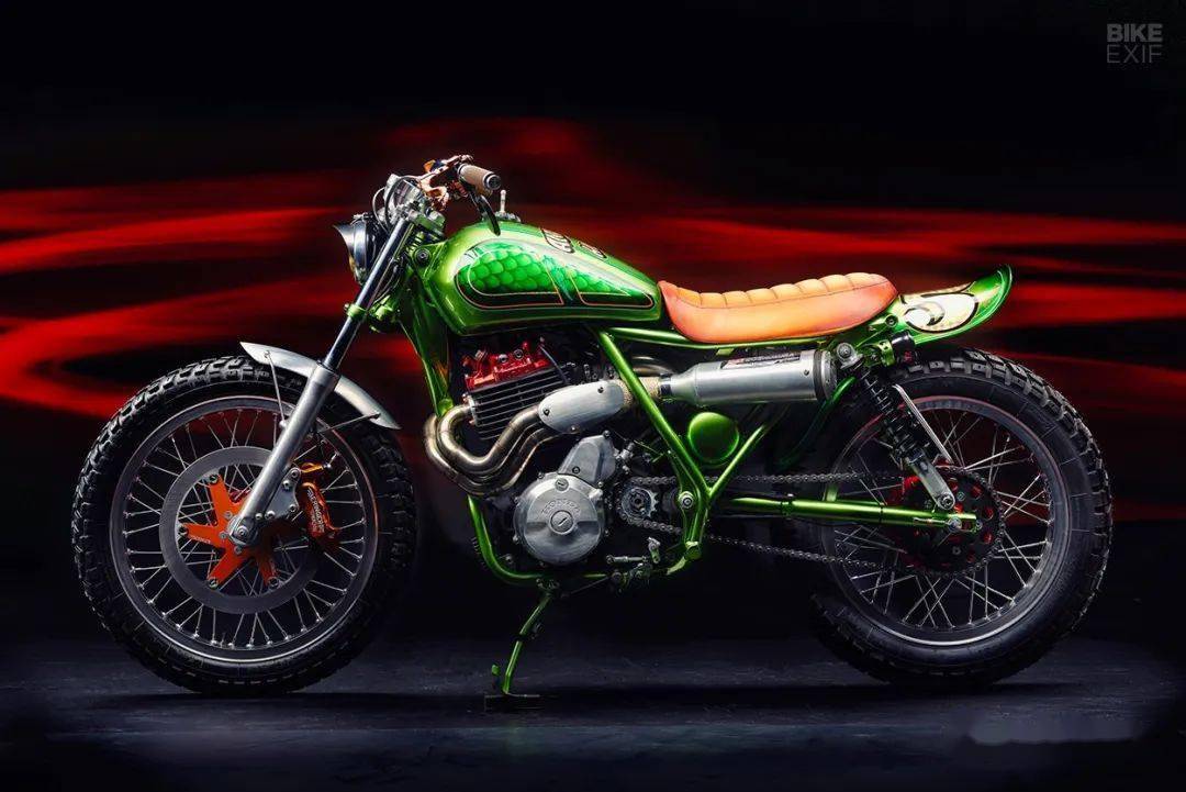 來(lái)自愛(ài)沙尼亞一家改裝工作室的作品,它的原型是一臺(tái)產(chǎn)自1988年的本田XBR500,走向scrambler的改裝風(fēng)格已經(jīng)讓人完全忘記了原車的樣子,作者給它起名叫“耍蛇人”,而油箱上的鱗片花紋,確實(shí)有點(diǎn)像一只大蛇。這部作品無(wú)論是整體亦或是細(xì)節(jié),都體現(xiàn)出了改裝者高超的技藝和審美要求,尤其是空濾和排氣管的設(shè)計(jì),一左一右相互照應(yīng)宛若天成,看起來(lái)非常舒服。