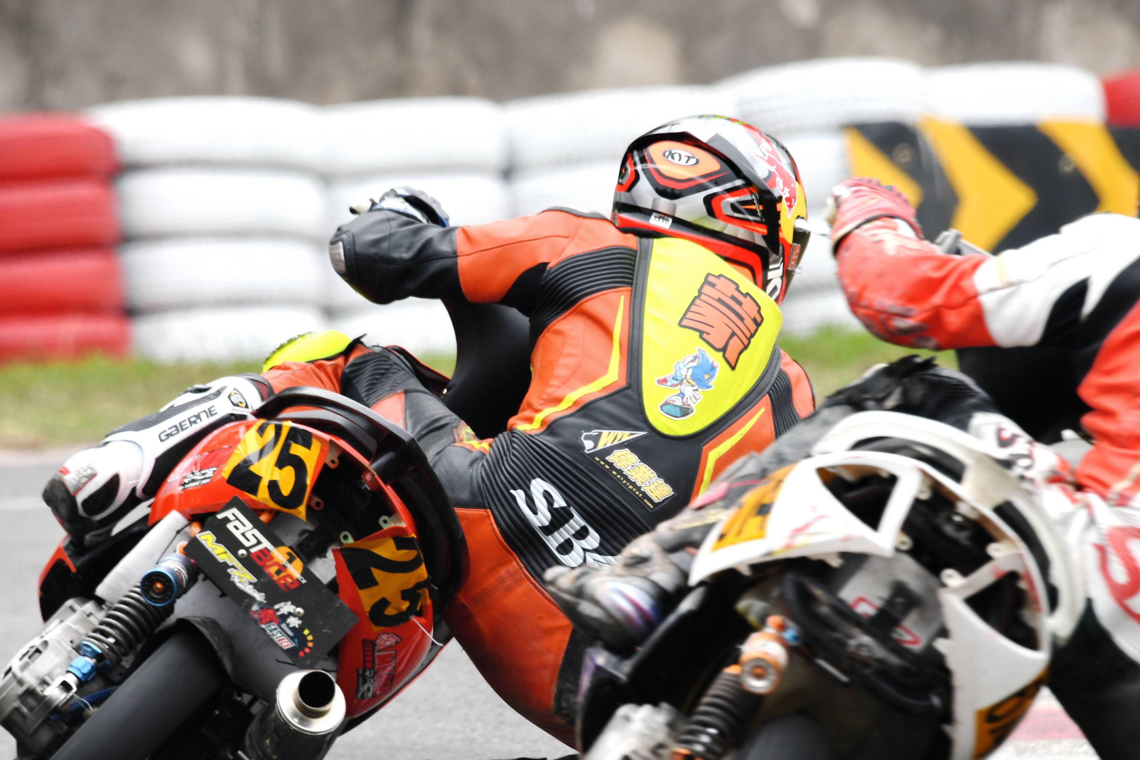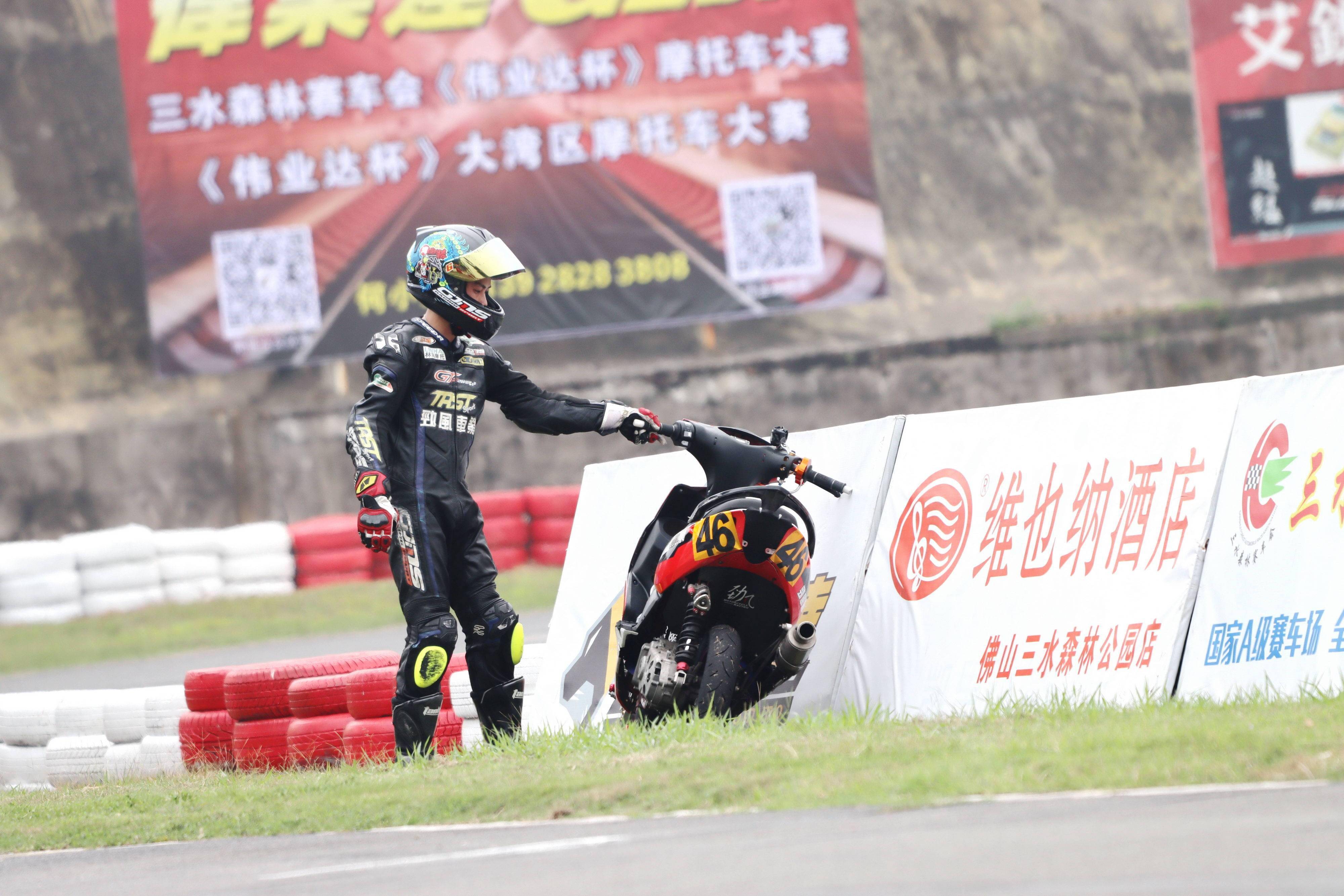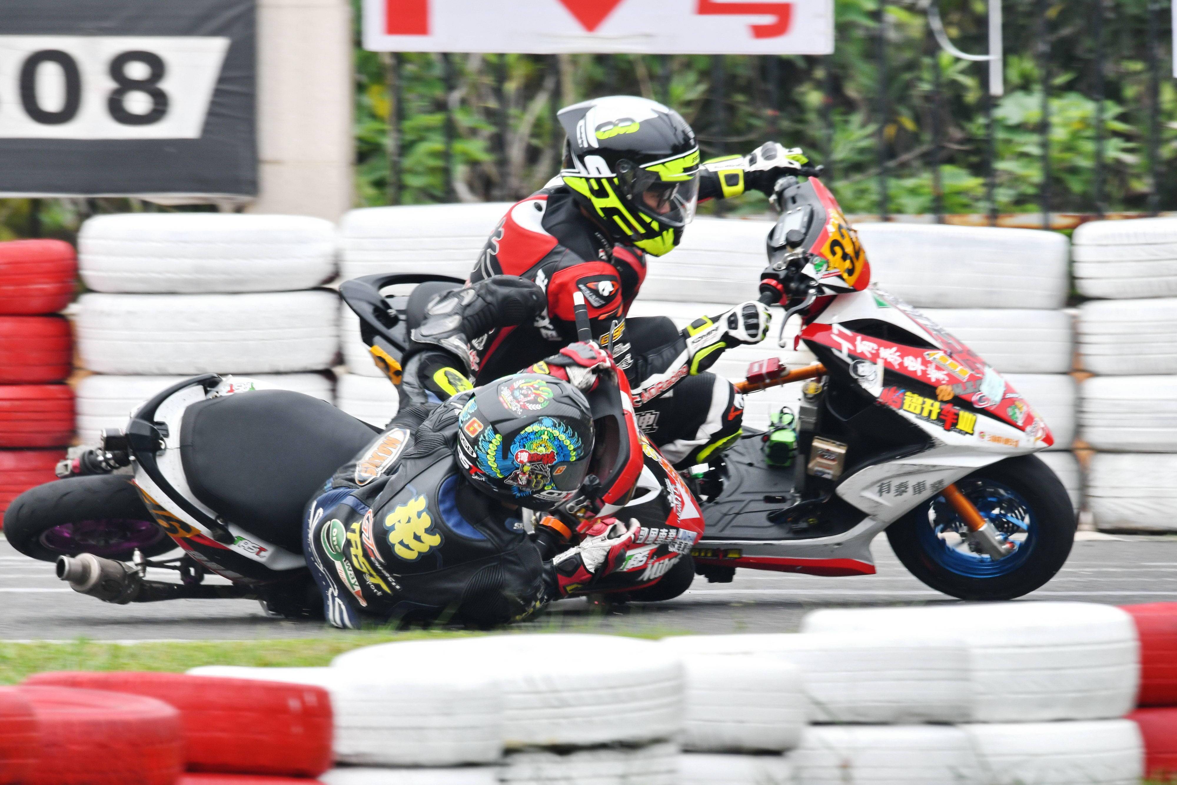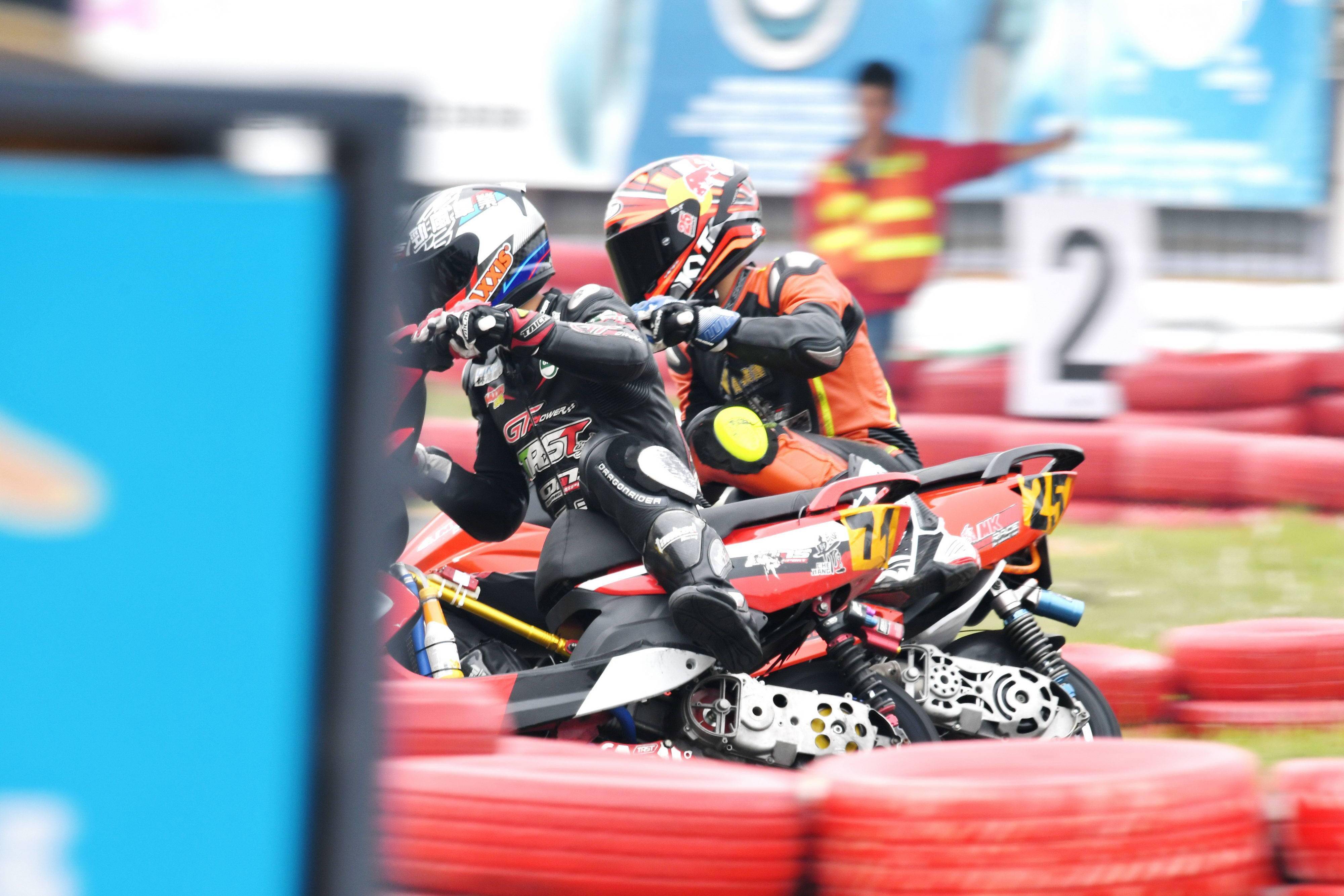 Arisun 艾瑞森輪胎改裝踏板 150cc 公開組,是偉業(yè)達(dá)杯比賽里焦點(diǎn)之一:這是一個(gè)堪稱 “ 碰碰車 ” 的較量,高速、短兵相接之下的磕磕碰碰,讓摔車成為了一個(gè)最常見不過的現(xiàn)象了。