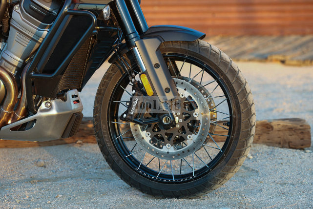制動(dòng)方面的規(guī)格依然很高,前320mm雙盤,后280mm單盤,前制動(dòng)為雙徑向安裝的四活塞卡鉗,后制動(dòng)為浮動(dòng)式單活塞卡鉗,均由Brembo提供,通過電子鏈接和控制具備彎道ABS功能,此外“越野+”模式還可以禁用后輪的ABS。車輪采用19英寸和17英寸的組合,搭配米其林Scorcher Adventure輪胎。