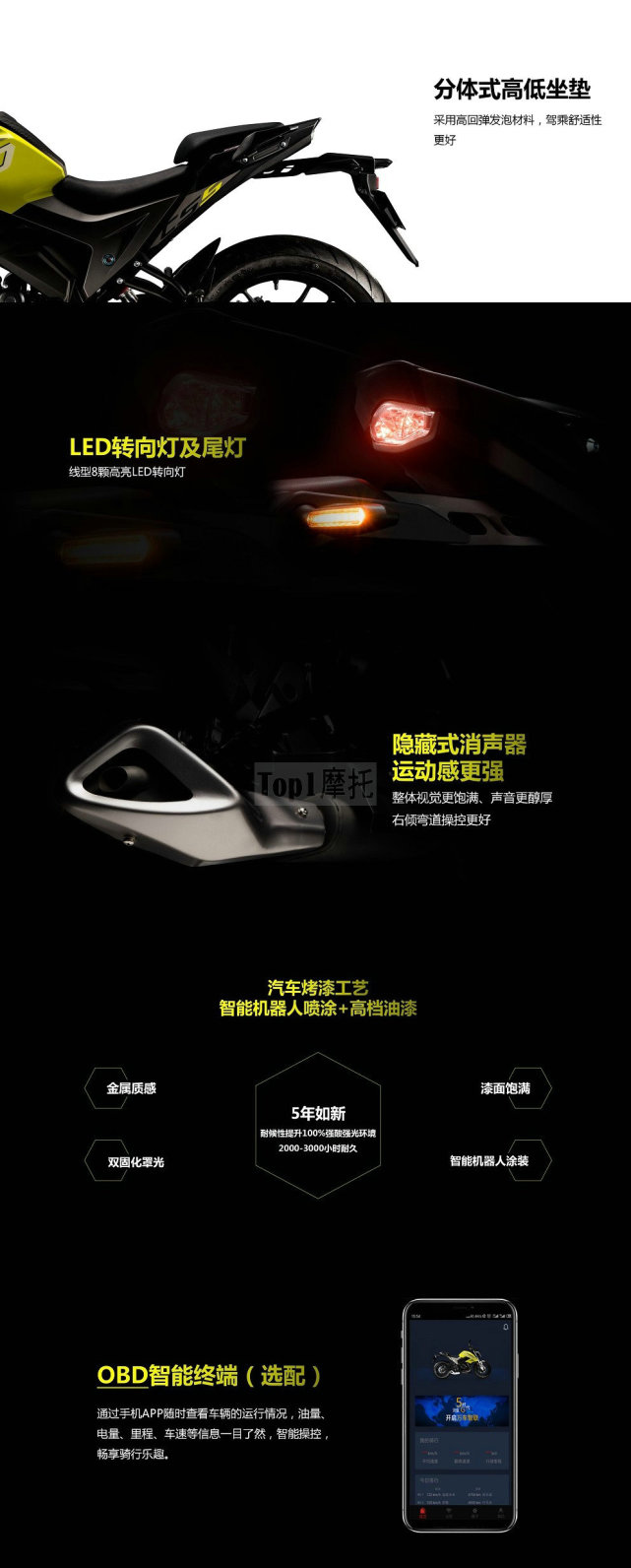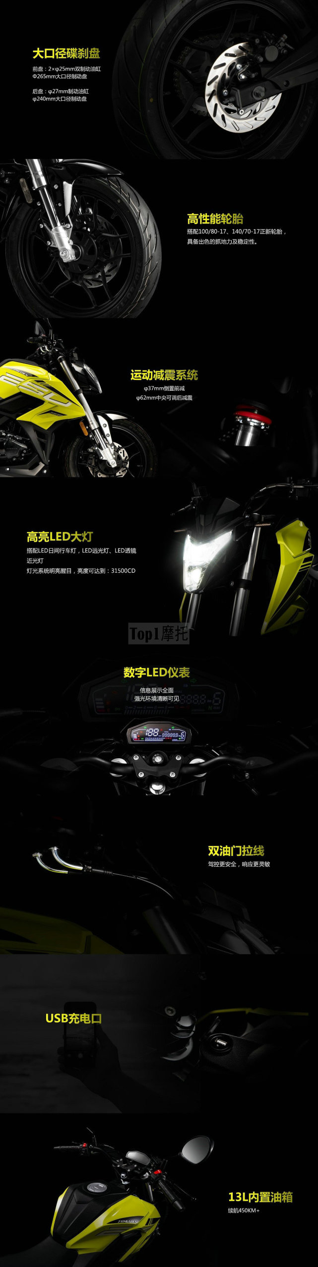 宗申250R其實(shí)并沒(méi)有什么特別亮眼的配置,前后碟剎+雙通道ABS、倒立式前叉、LED大燈、LED儀表、雙油門(mén)拉線(xiàn)、USB充電接口、OBD智能終端(選裝),足夠日常使用。