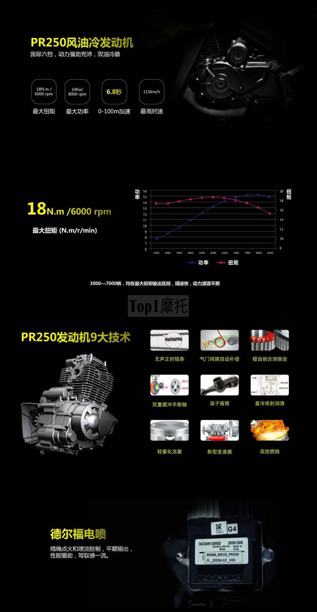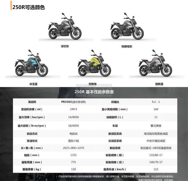 宗申250R搭載一臺(tái),249.9cc的風(fēng)油冷發(fā)動(dòng)機(jī),最大功率14kw/8000rpm,最大扭矩18Nm/6000rpm,廠(chǎng)家表示0-100米加速只要6.8秒,最高時(shí)速115km/h,其實(shí)這組數(shù)據(jù)并不亮眼,比起250NK(19.5kw/22Nm)的表現(xiàn)差距并不小,價(jià)格也只便宜了1100塊。