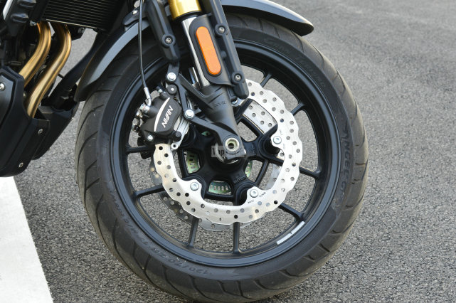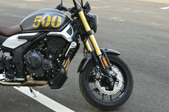 剎車方面,基本保持了與街車500R相同的規(guī)格,298mm的雙碟剎盤,日清雙活塞剎車卡鉗,后剎車是240mm的單盤,日清單活塞剎車卡鉗,標(biāo)配博世雙通道ABS防抱死功能。