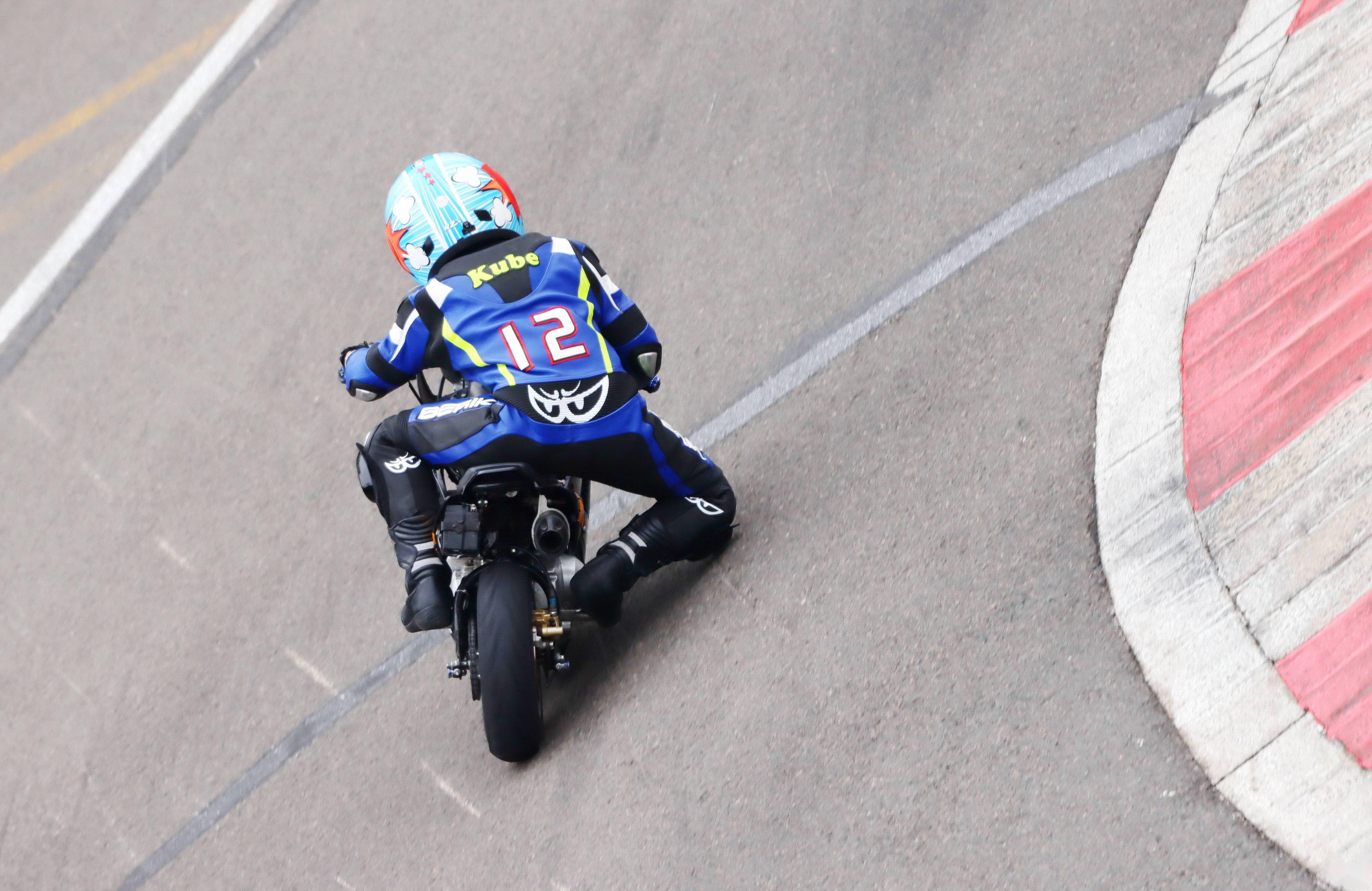 小童 B 組的比賽有十三位小車手參加。該組別的賽車規(guī)格,是國產(chǎn)四沖程單氣缸、兩氣閥的發(fā)動機,排氣量 57cc 以下,前、后車輪的直徑在 8 英寸或以下。