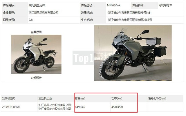 最大馬力61匹 配鮑魚卡鉗 摩托莫里尼650ADV現(xiàn)身工信部