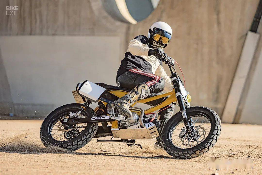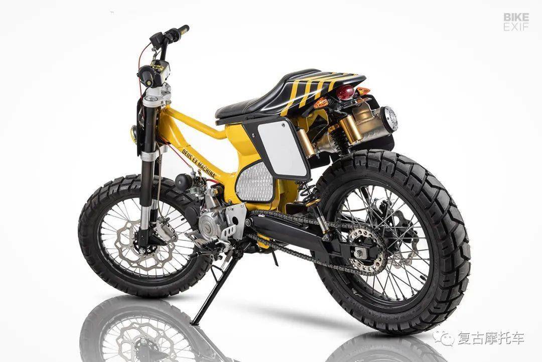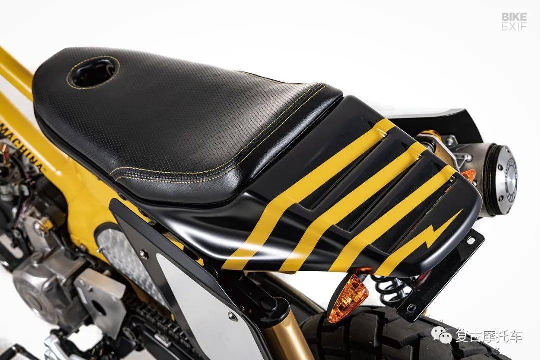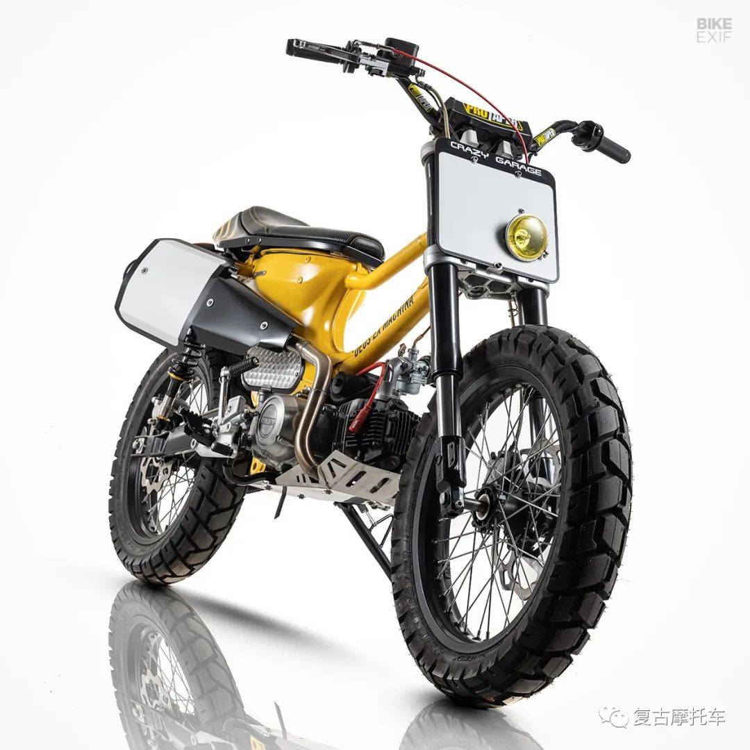 在這個改裝中,Crazy Garage使用了來自FB Mondial Hipster 125(也就是宗申的CR150的出口版)的前叉、聯(lián)板、車輪,縮短了后叉的長度,更換了一對可調(diào)式的后減震器,還使用了Shinko Trail Master的輪胎。