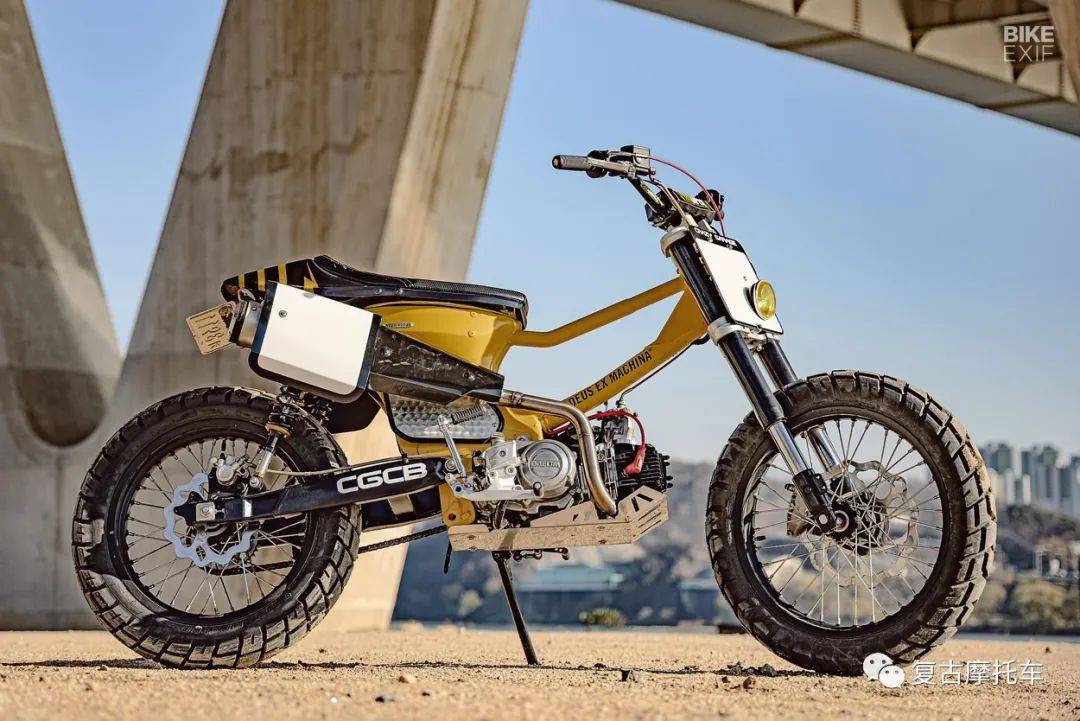今天這部車就是由Daelim Citi Ace 110改裝而來,看它裸露的車架,幾乎和幼獸一模一樣。這臺有點BMX風(fēng)格又有點street tracker風(fēng)格的小車是Crazy Garage為Deus ex Machina在漢城的分部所打造,由圖一到圖二,絕對不僅僅是拆了外殼那么簡單。
